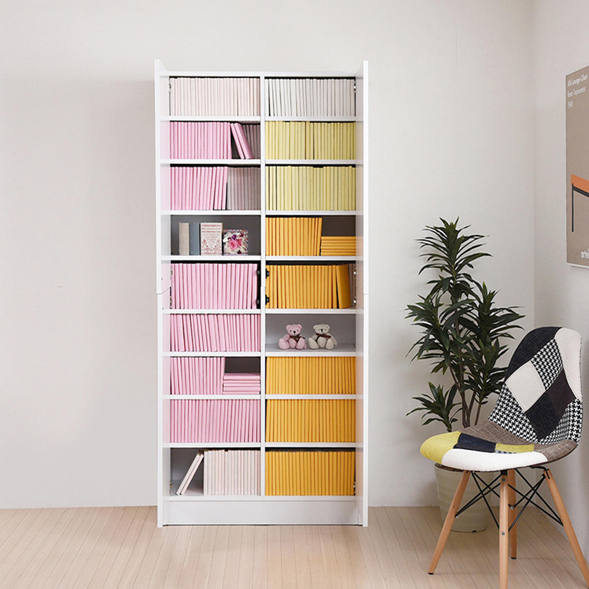 中間固定棚が無いから自由度と収納量がアップ扉は上段・下段と分かれているので用途に応じて使い分けしていただけます。中間固定棚が無いことで、中央部分にも書籍が収納できるなど大容量収納が可能です。