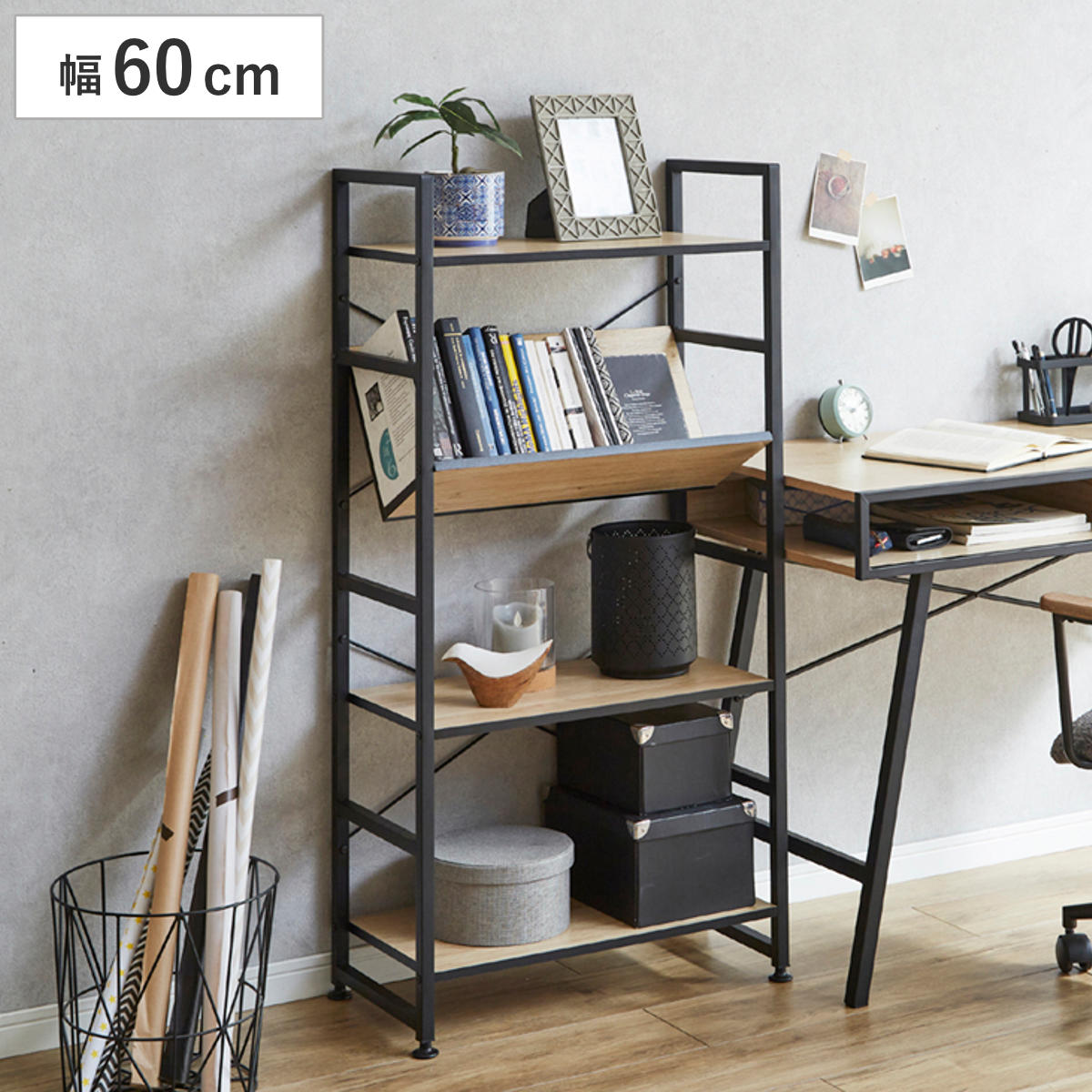 ブラックアイアン×古木風のシェルフ 4段シンプルなデザインで空間に馴染みやすいシェルフです。古木風のリアルな木目を再現した3Dシートを使用しており、ブラックアイアンと組み合わさりモダンな風合いです。リビングや寝室、デスク横など様々な場所でお使いいただけます。