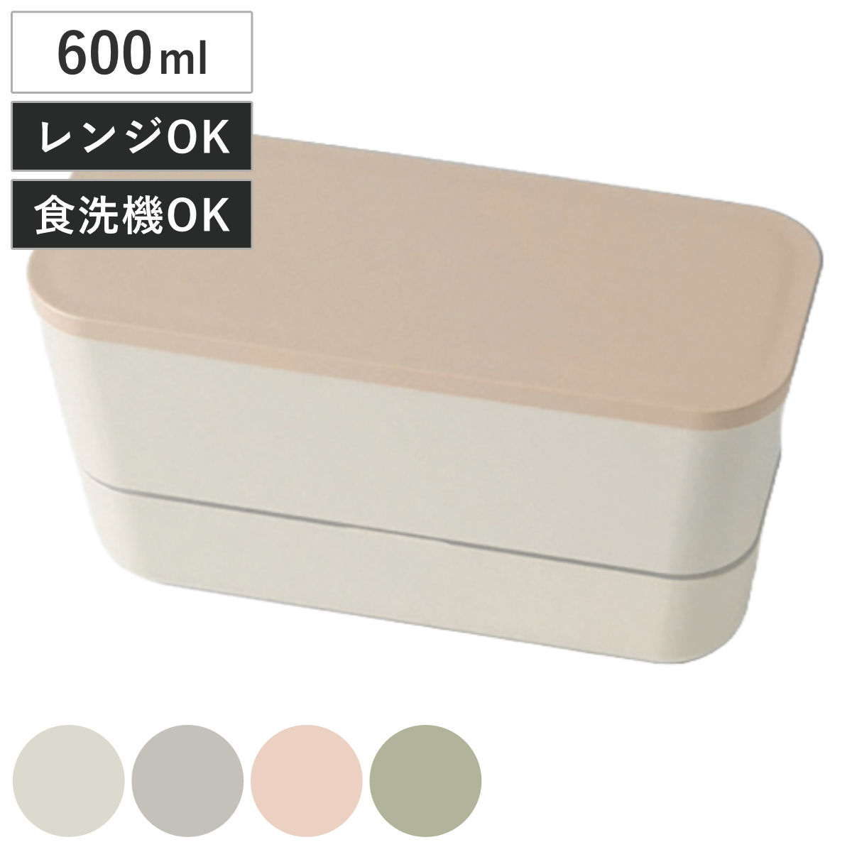 シンプルで使いやすいランチボックス 600ml4色のナチュラルカラーが魅力の二段式で、学校や職場のランチも彩り豊かに楽しめます。手に馴染みやすい角型で、屋外で食べる際も安心です。毎日使っても飽きの来ないシンプルなデザインで、世代問わずお使いいただけます。