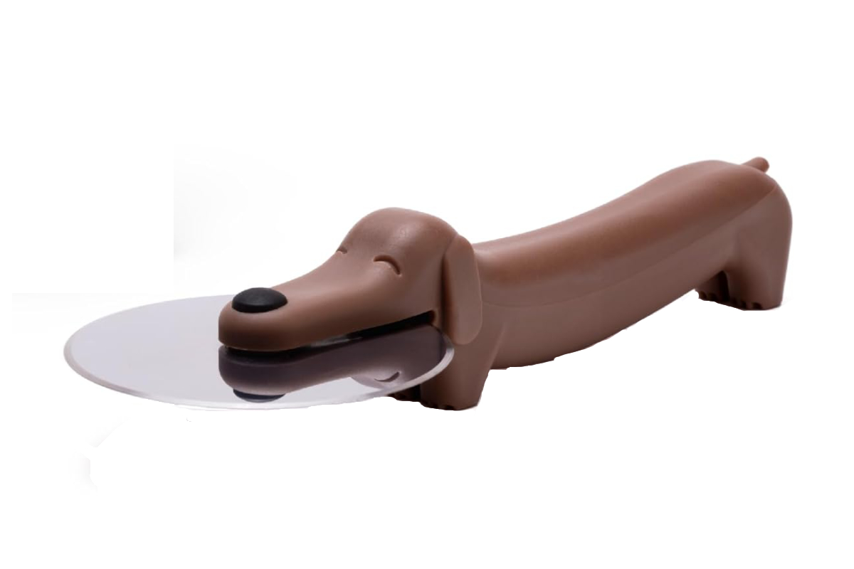 ご機嫌なワンちゃんがピザを切り分け【ドッグ】フリスビーをくわえた姿に見えるキュートなピザカッター。短い足で自立してくれるので、机を汚さずに置けます。