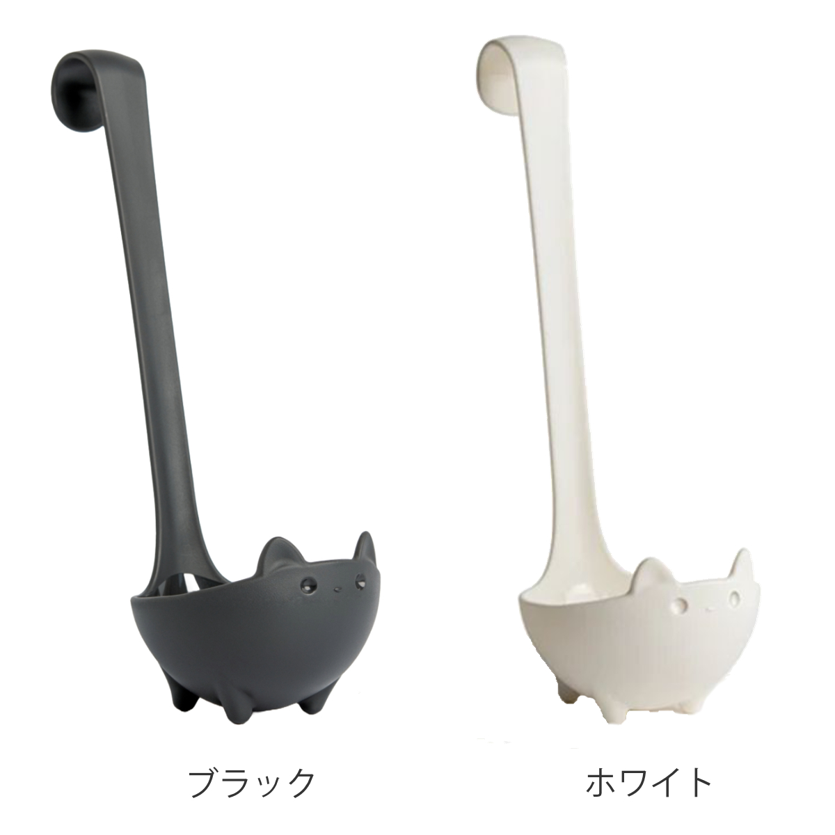 ピンとのびたシッポが自慢の猫ちゃんお玉遊び心あふれる、機能的な黒猫・白猫のお玉です。つぶらな瞳や、短い脚、丸いフォルムがとても愛らしく、癒されます。丸く深さがあるので、スープや食材を一度にたっぷりすくうことができます。