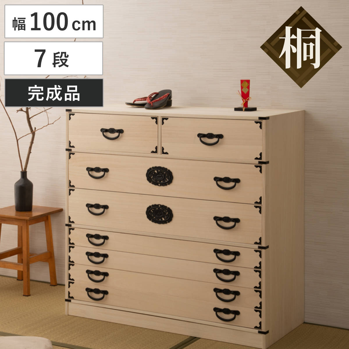 | 材質 | 本体:天然木桐材 引出し底板・背板:天然木桐化粧板 装飾金物:ダイカスト |