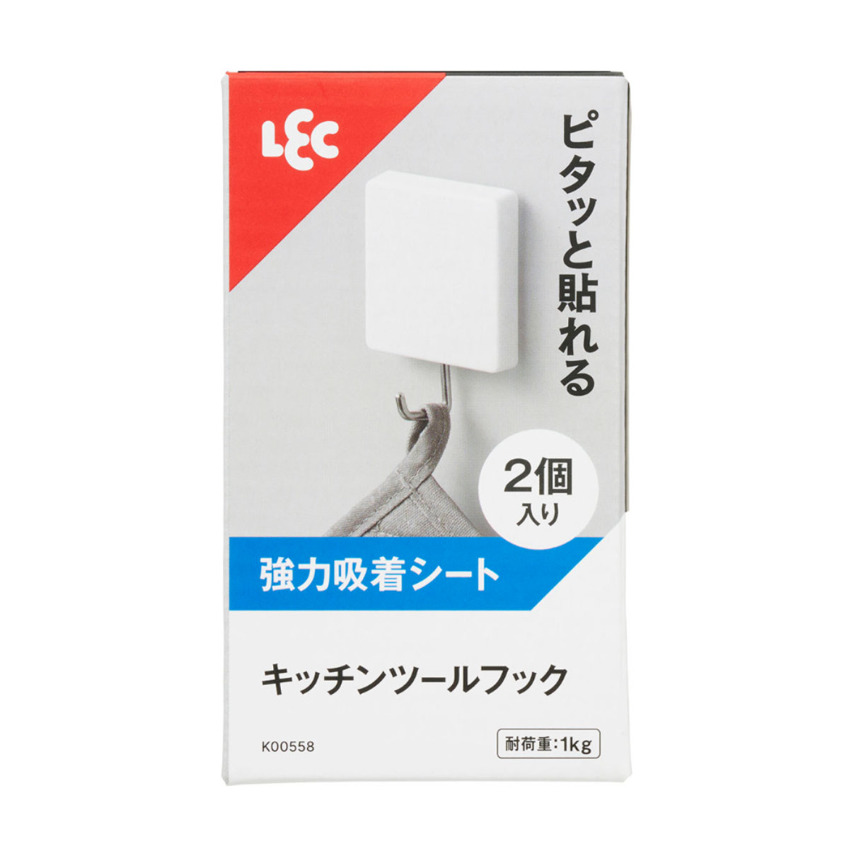 ピタッと貼れるキッチンツールフック2個入強力吸着シートでしっかり取り付けられるキッチンツールフックです。キッチンでミトンや栓抜きなど、よく使う物を吊り下げて収納できます。