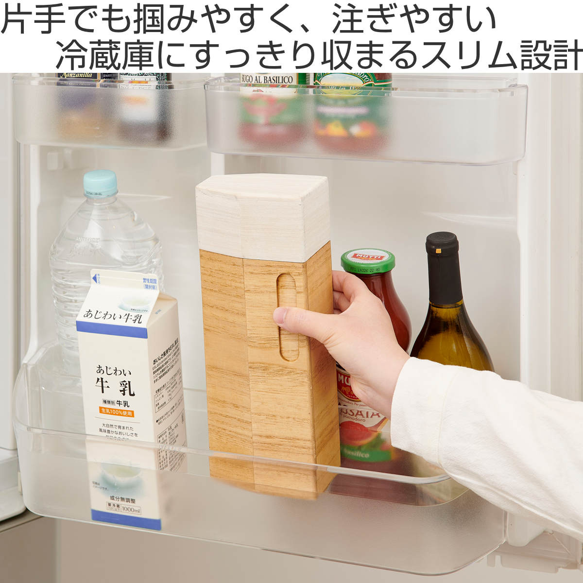 側面のくぼみと鋭角の注ぎ口は片手でも持ちやすく、女性にも使いやすい形状です。必要な時に冷蔵庫からの出し入れがスムーズにできます。
