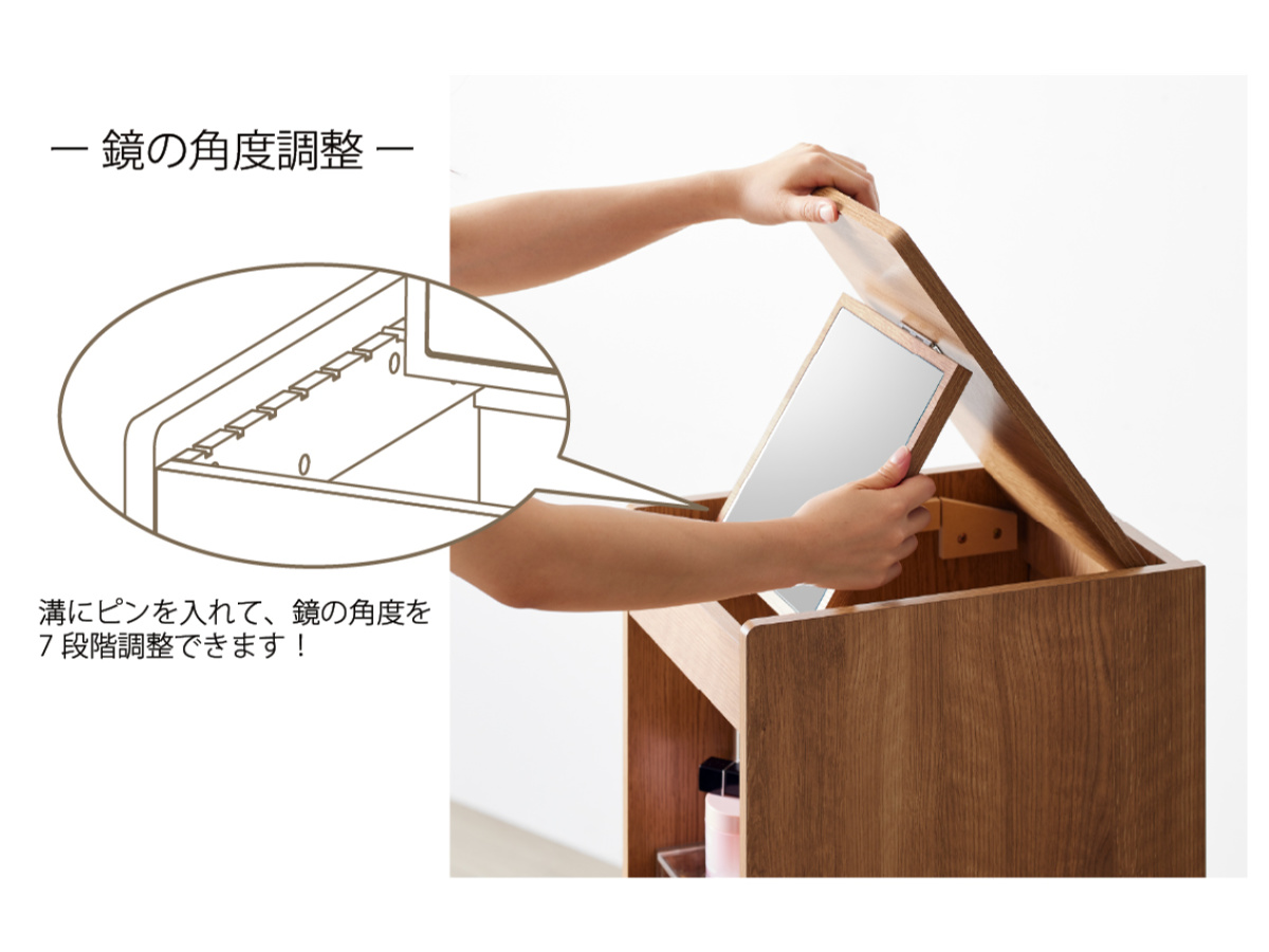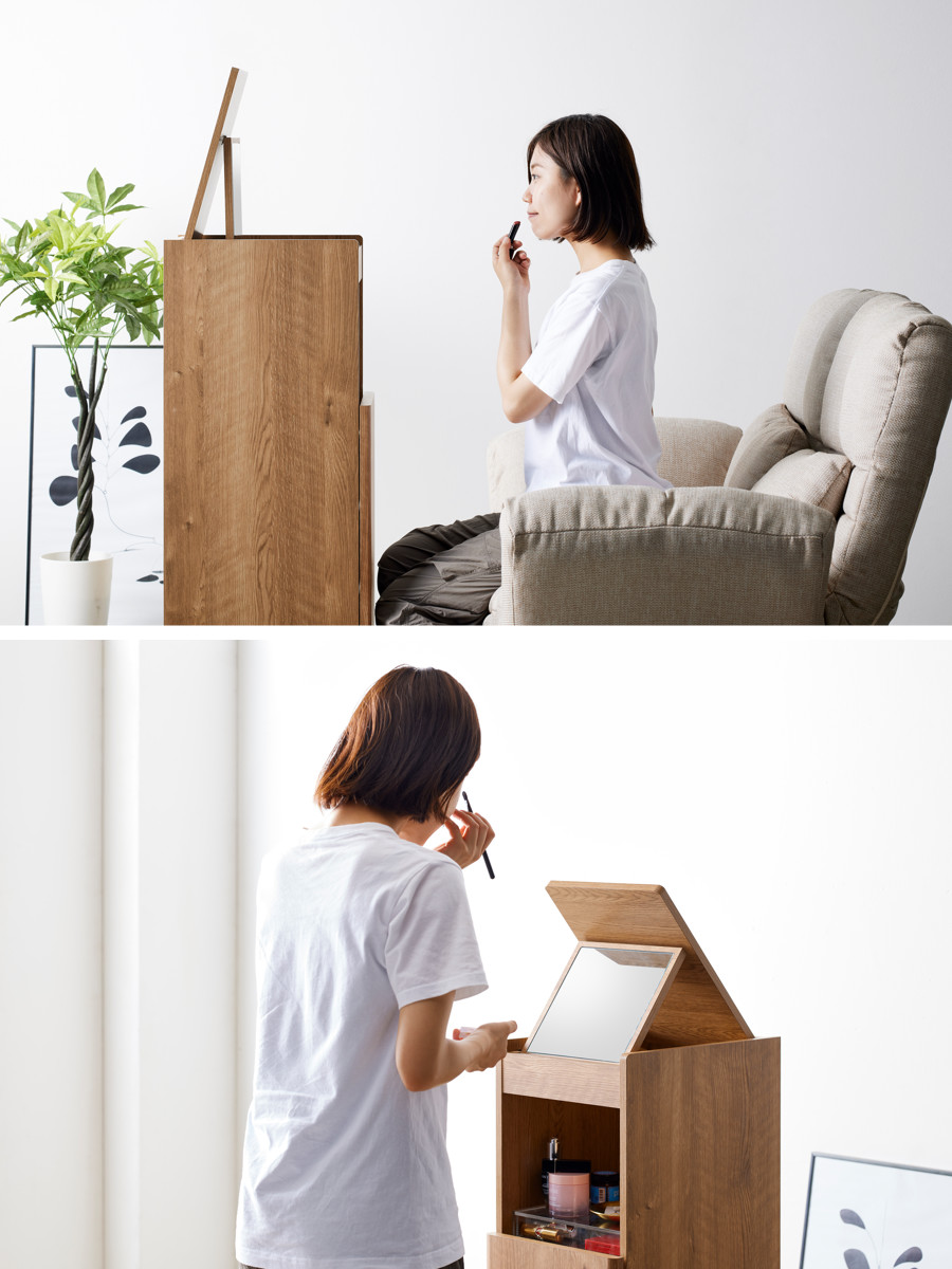 ●鏡の角度を調整すれば、ソファに座りながらでも、立ったままでもメイクができます。