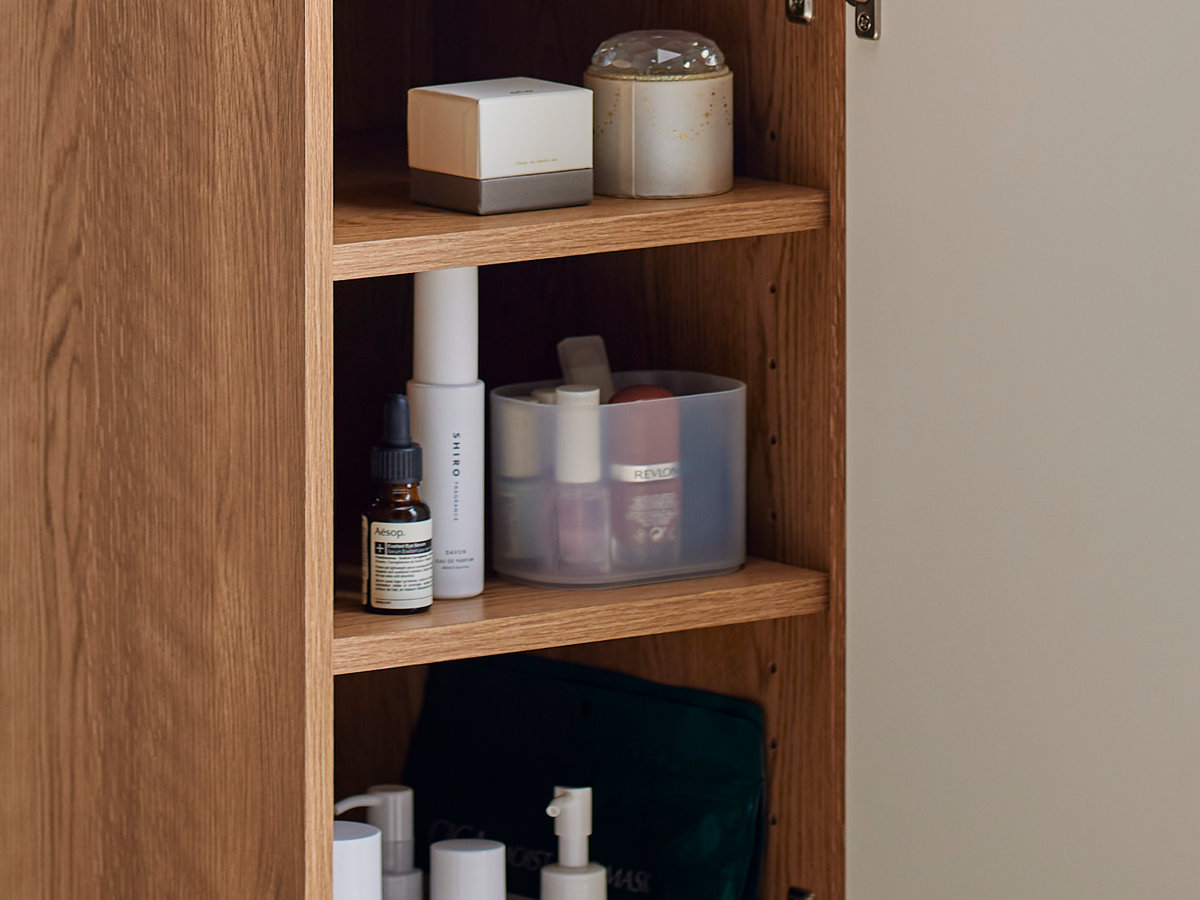 上段のオープン収納にはよく使う物や、見せておきたい可愛いコスメの置き場に。扉収納には、使用頻度の低い物や見せたくない物、ヘアスプレー、パックやコットンなどのストックの収納にもぴったりです。