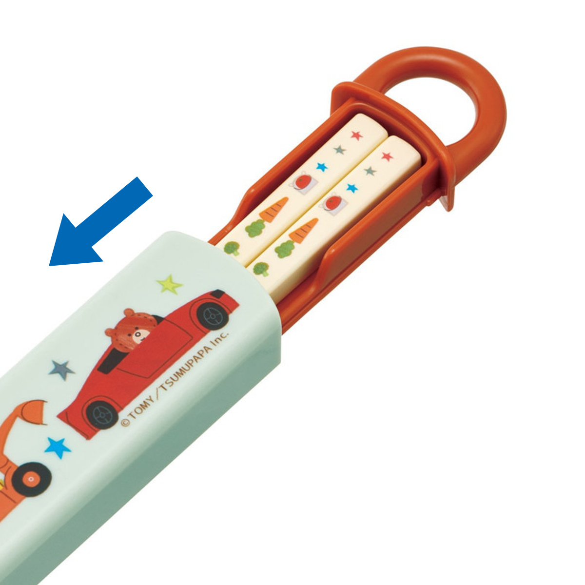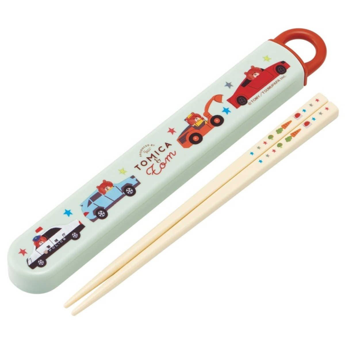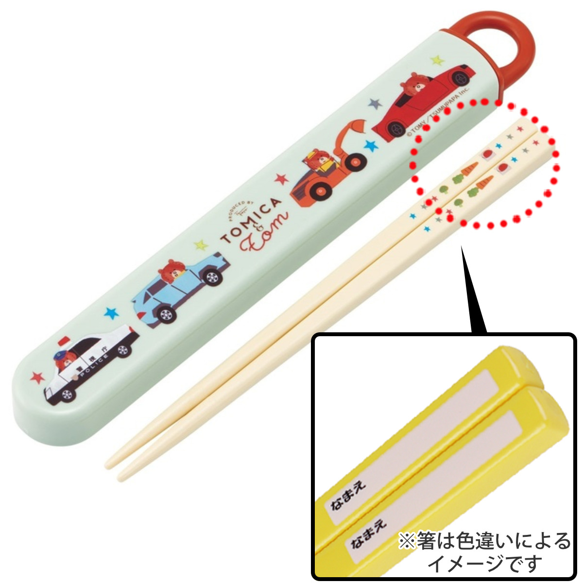 食洗機対応のスライド式で開けやすい箸・箸箱セット●トミカとトムの開けやすいスライド式箸箱とお箸のセットです。
