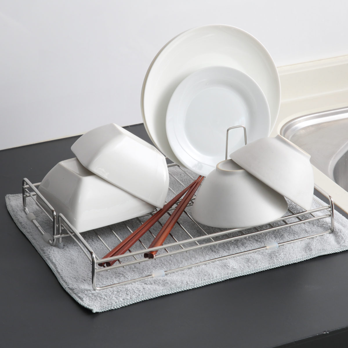 ![]() 包丁を立てて水切り・収納できるスタンド | ![]() 水切りマットとしても使える厚手のふきん |