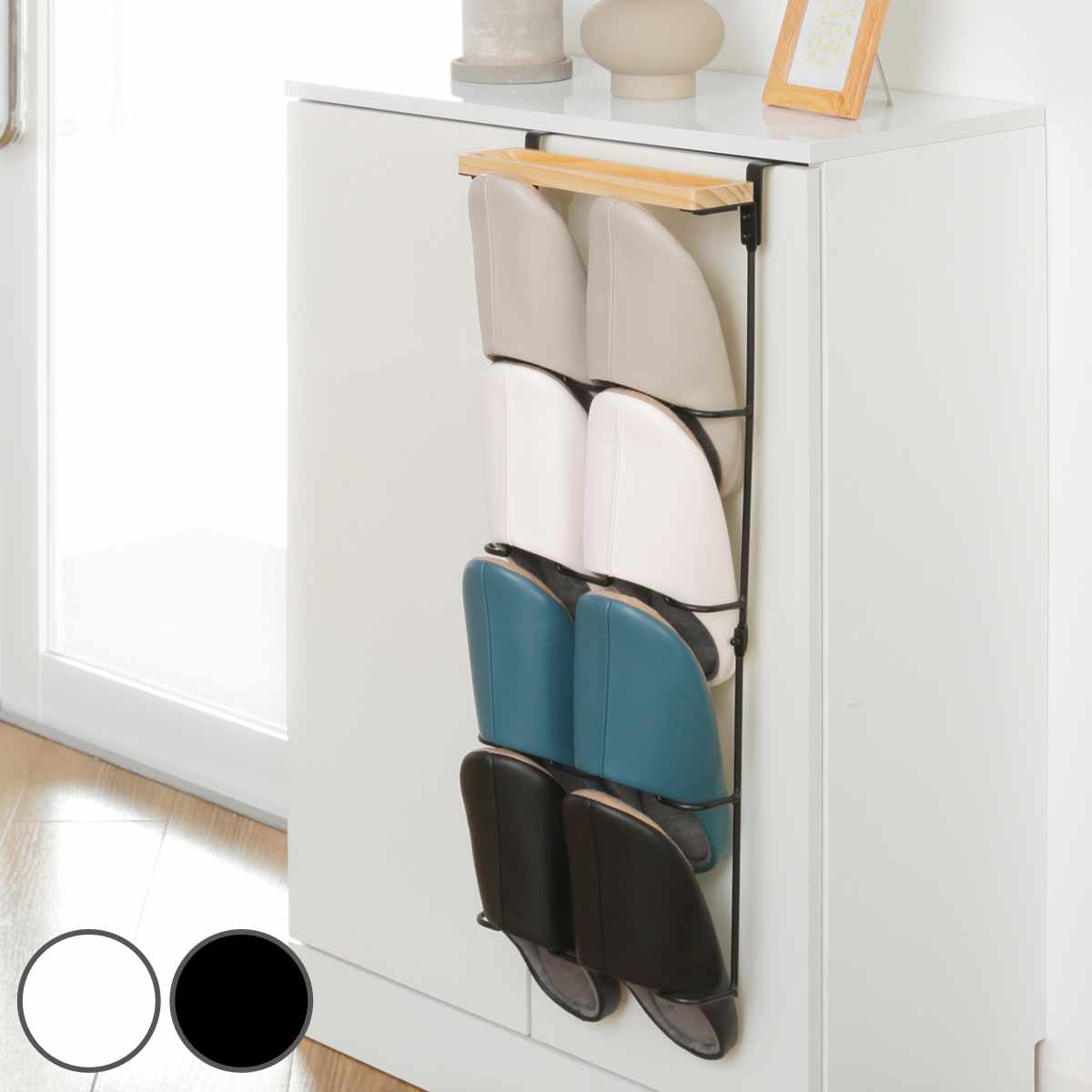 4足収納できる靴箱に掛けるスリッパラックです。コの字型フックを使用し、下駄箱の扉に取り付けることができます。
