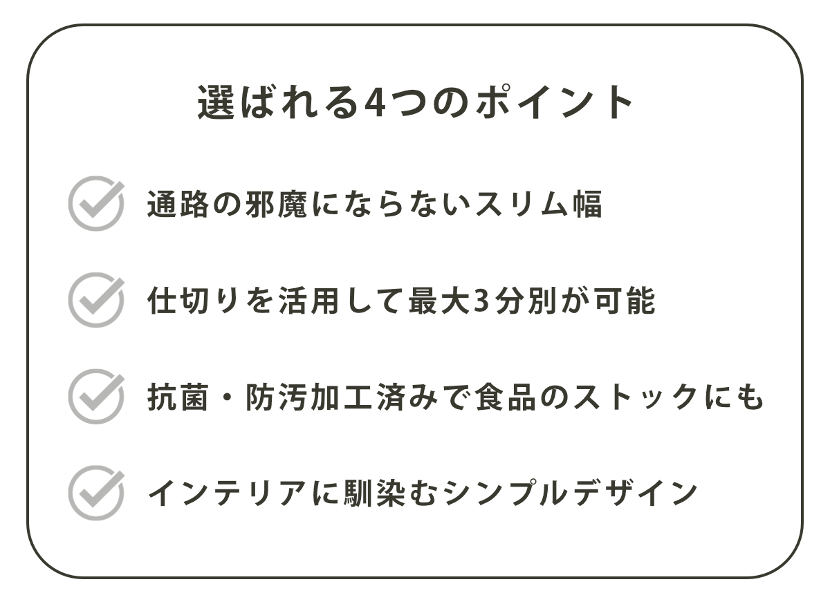 ●壁際やキッチンサイドに最適な薄型で、棚下にも収まるので動線を妨げません。