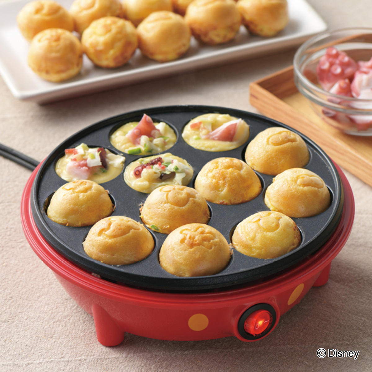 ミッキーデザインのたこ焼き器で食卓をもっと楽しく!●一度に12個作れる、ミッキーデザインのたこ焼き器です。