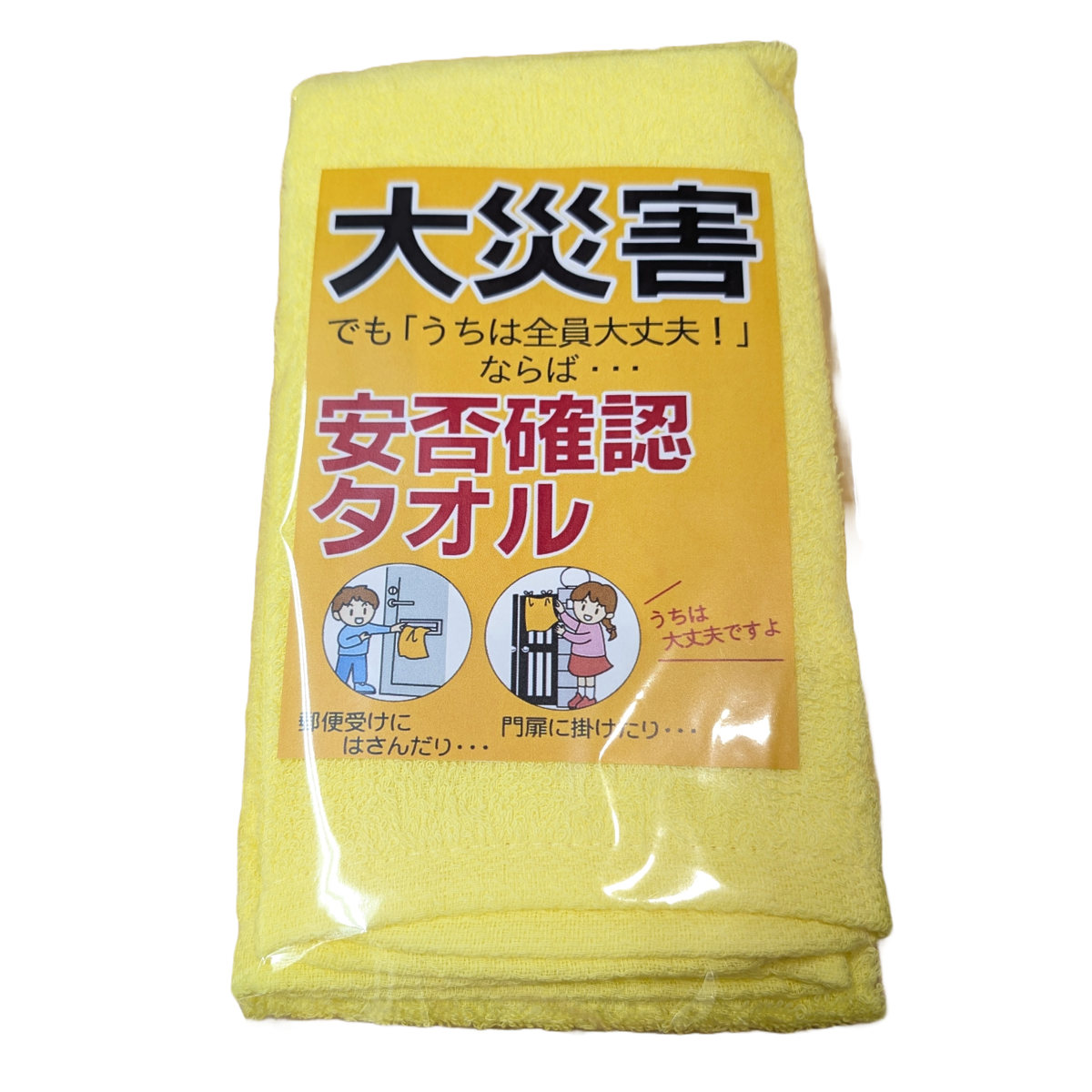 災害発生時に玄関やベランダなど見える場所に掲げて、家族全員が無事であることを知らせるタオルです。本当に救助を必要としている人を早く発見する手助けになります。手ざわりの良い綿100%なので、普段用のタオルとしてもお使いいただけます。