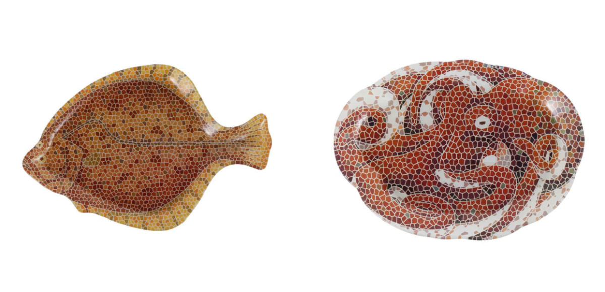 地中海をイメージした遊び心とユーモアに溢れるガラスプレートです。爽やかな色彩とモザイク調のデザインが特徴的で、食卓を賑やかにしてくれます。FLOUNDER型(ひらめ)とOCTOPUS型(たこ)は幅25〜30cmほどで大皿として使えるサイズです。