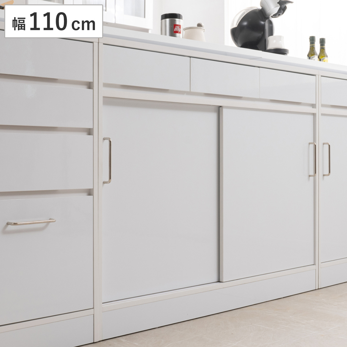 造りつけのようなカウンター下収納 引き戸式扉 幅110cm造りつけのような、スクエアでシンプルなフォルムのカウンター下キャビネット 幅110cm(画像:真ん中)です。引き戸式の扉でお部屋をスッキリとした印象にしてくれます。