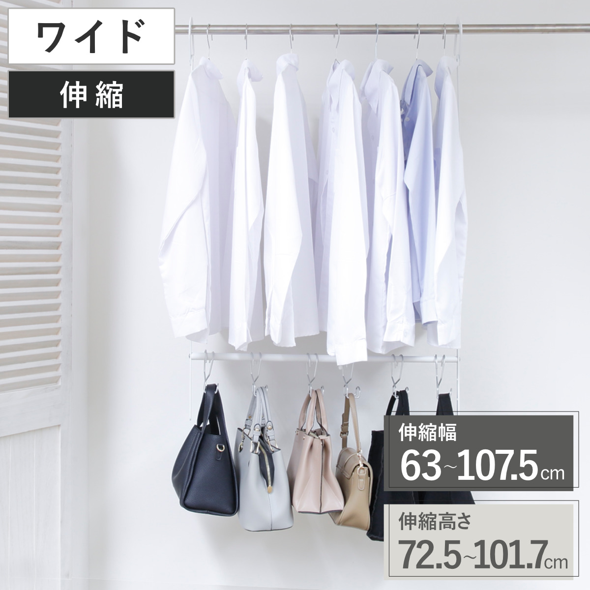 クローゼットやコートハンガーのハンガーバーに掛けるだけで、上下2段階掛けになって収納力がアップする伸縮式の