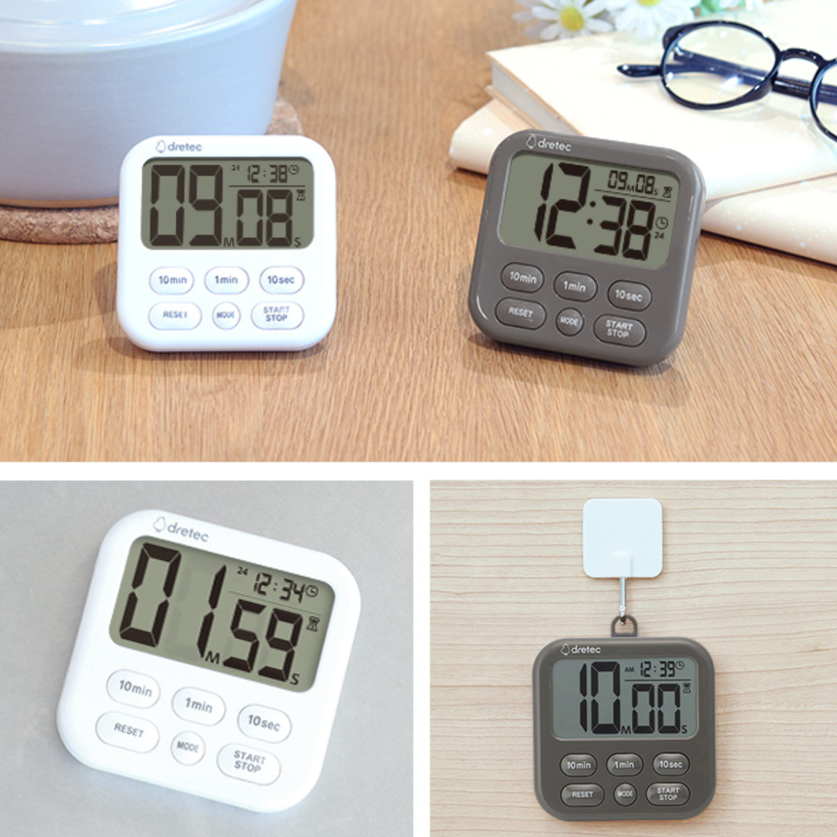 切り替え不要!1つの画面でタイマーと時計が確認できる●画面の切り替え不要で、タイマーも時計も確認できるキッチンタイマーです。