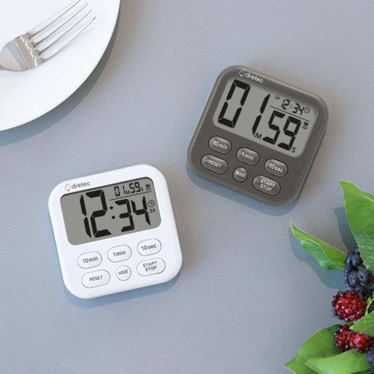 タイマーと時計を1つの画面で確認できる画面の切り替え不要で、タイマーも時計も確認できるキッチンタイマーです。料理中など、タイマーも時計も確認したいときにおすすめです。大画面で見やすいのも嬉しいポイントです。