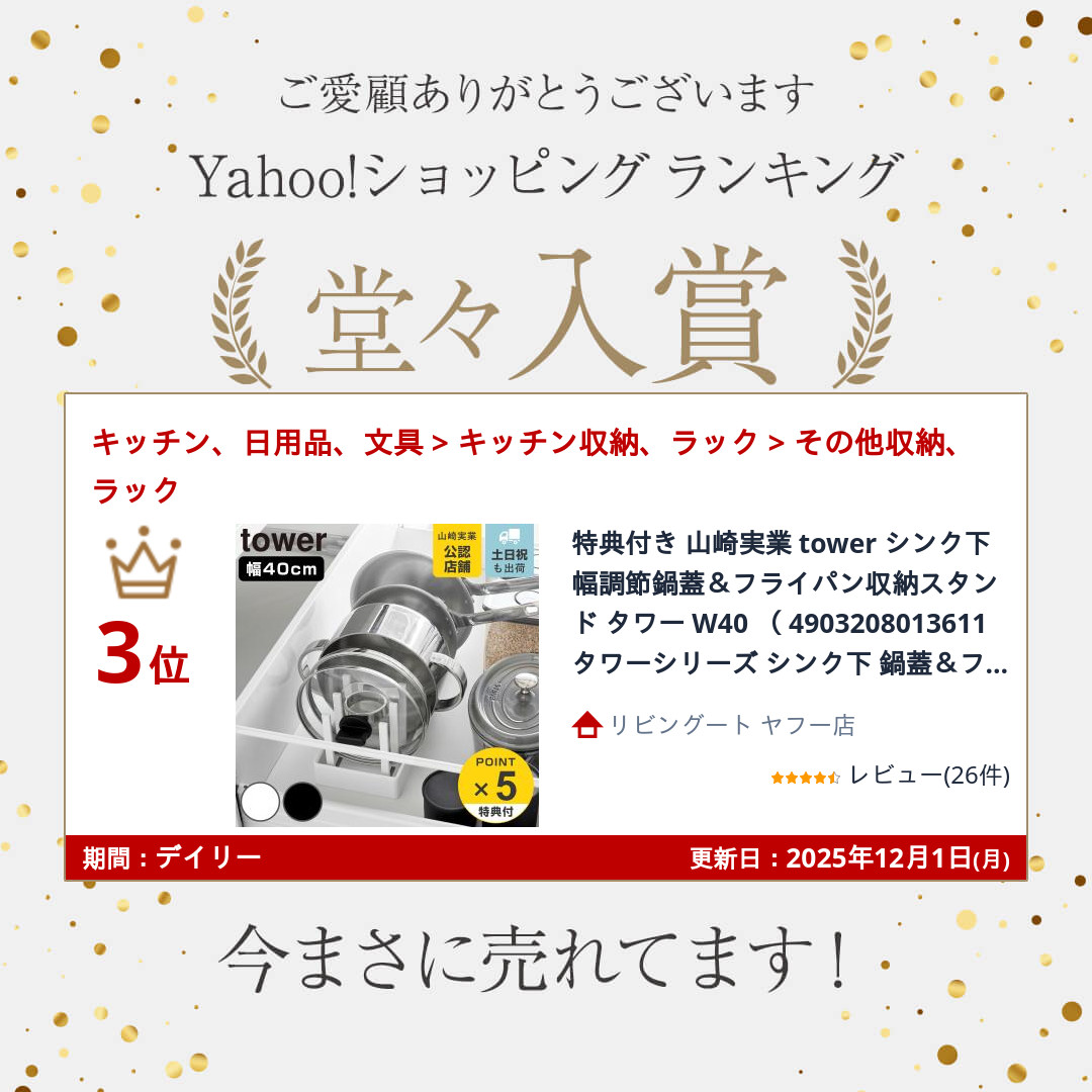 ![]() 伸縮収納棚 タワー | ![]() シンク下 鍋蓋&フライパンスタンド タワー | ![]() ディッシュストレージ タワー |