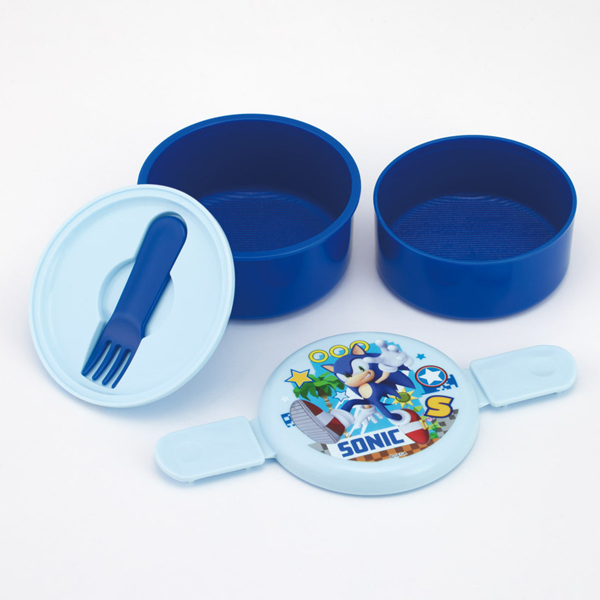 便利なミニフォーク付き、丸型ランチボックス丸型のかわいい2段タイプのランチボックスです。プラスチック製のミニフォーク付きで別でカトラリーを持ち歩かなくても大丈夫です。食べ終わった後は、下段に上段を収納できる入れ子式で、コンパクトに持ち帰ることができます。