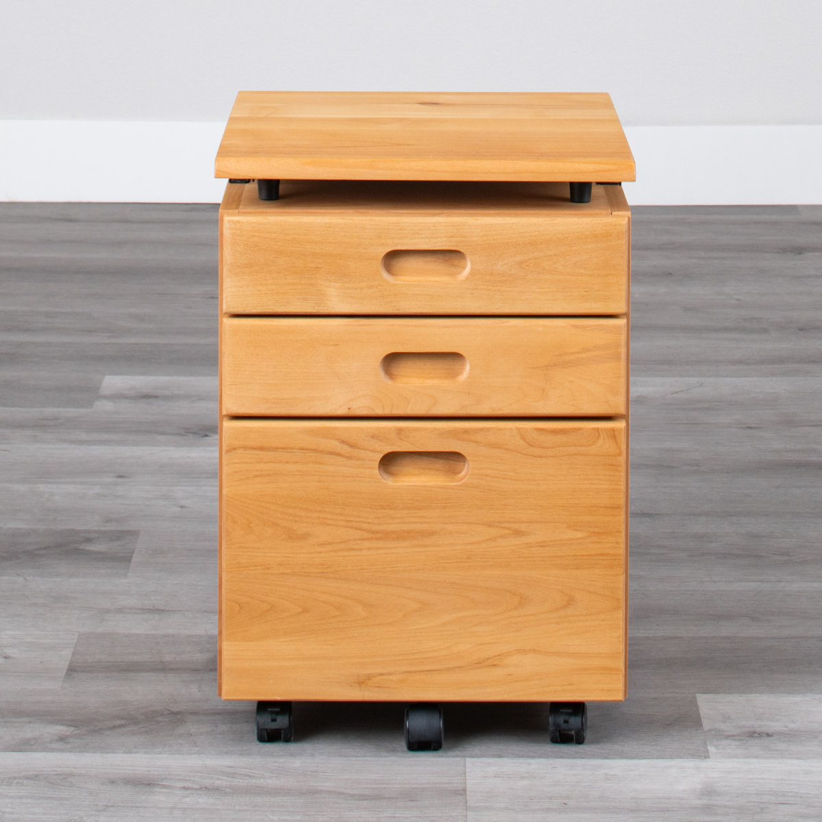 フルオープンレールの引出し付き3杯の引出しで豊富な収納スペースがあり、フルオープンレール付きですので、物を取り出しやすいです。下段は深めになっていますので、ファイルなどを入れて整理できます。