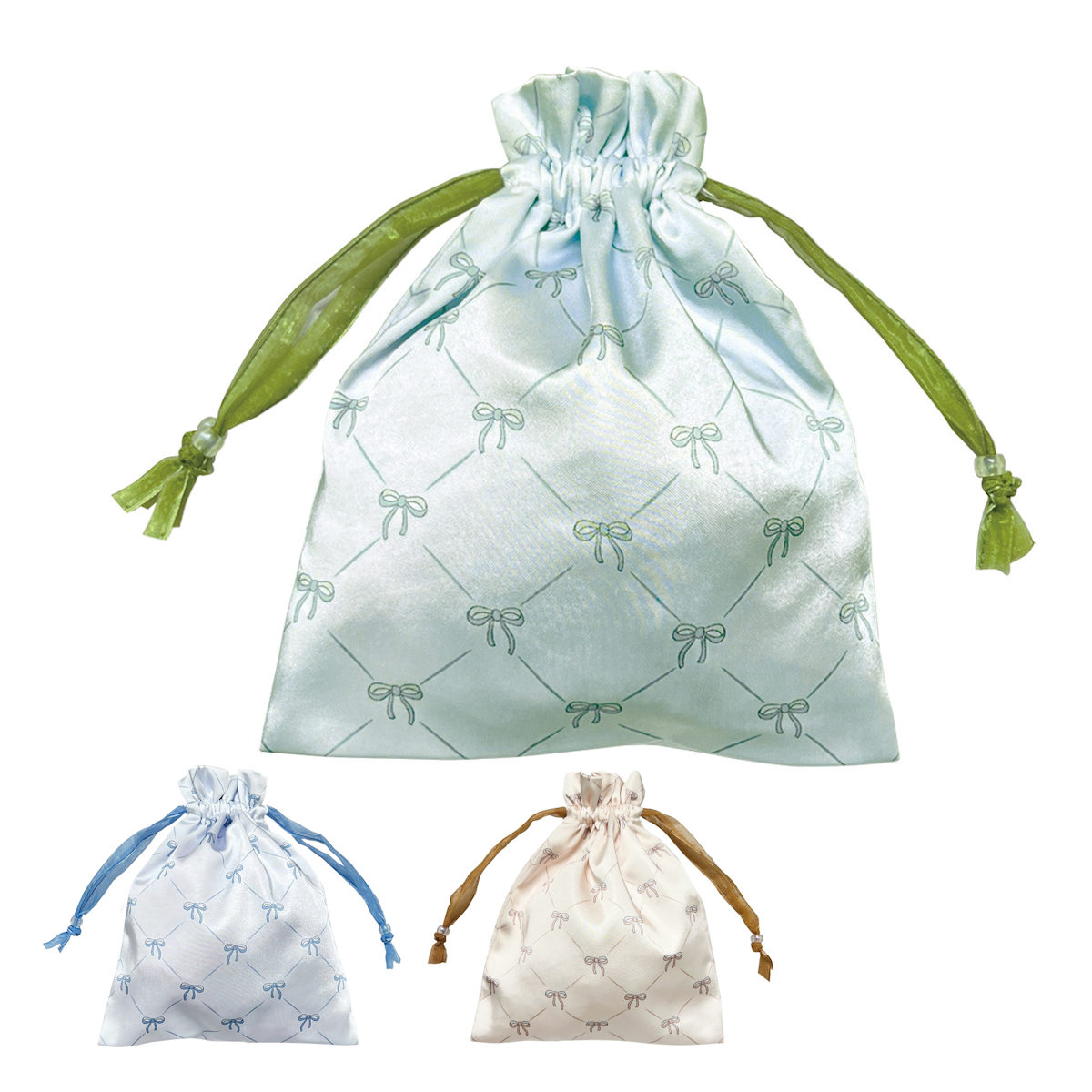 リボン柄が可愛くて、なめらかな使い心地●サテン生地を使用した、なめらかで心地良い巾着袋です。