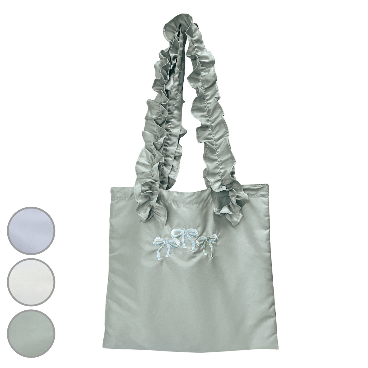 持ち手のフリルが目を惹くトートバッグです。バッグにはリボン柄の刺繍が入っており、可愛さと上品さも兼ね備えたお洒落なアイテムです。A4サイズ対応なので、通勤通学にもおすすめです。
