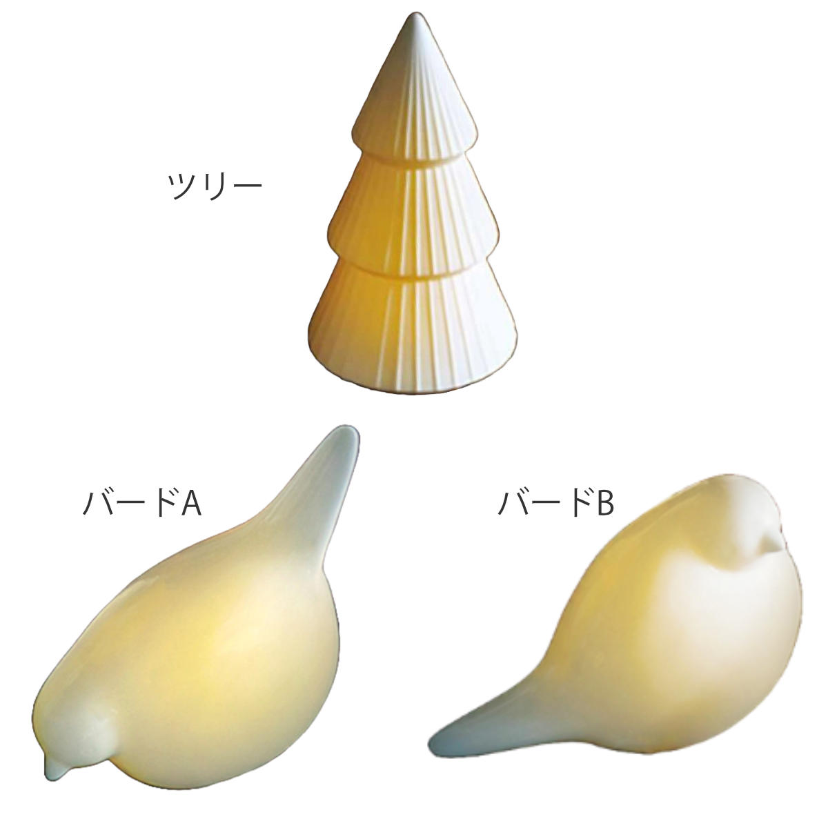 | サイズ | 【ツリー】約直径10.1×約高さ16.4cm 【バードA】約直径7.7×奥行13.5×高さ15.1cm 【バードB】約直径7.3×奥行16.8×高さ11.8cm |