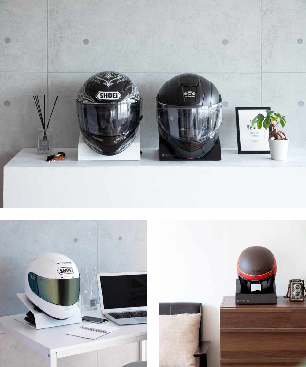![]() コンパクトな ヘルメットディスプレイスタンド 【▲このページの商品】 | ![]() 小物を置ける棚付き ヘルメットディスプレイスタンド | ![]() 2個置きタイプ ヘルメットディスプレイスタンド |