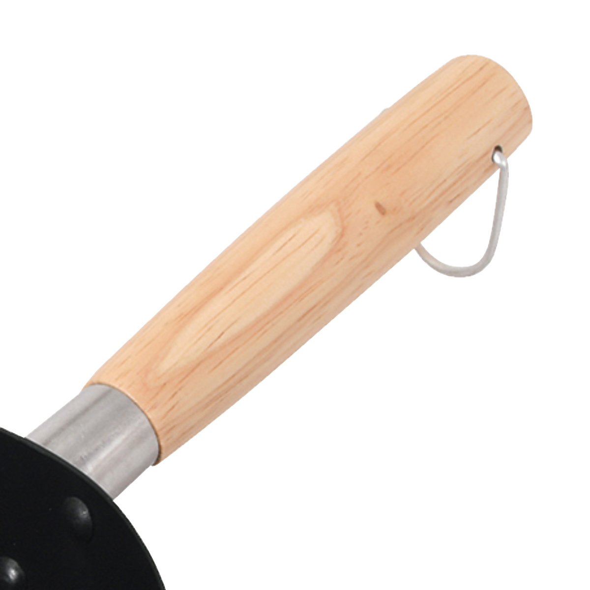 先端リング付きで吊るせる、木製ハンドル天然木製のハンドルは熱が伝わりにくく、長時間の調理でも扱いやすい素材です。ハンドル先端にリングが付いており、フックに掛けて壁収納できます。