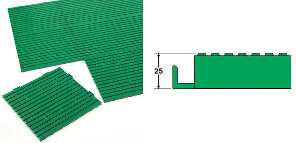| 表面形状 表面は滑りにくいノンスリップ形状です。 | 裏面形状 通気性も高く、防湿用床材にも適しています。耐久性に優れ、湿気を防止します。 |