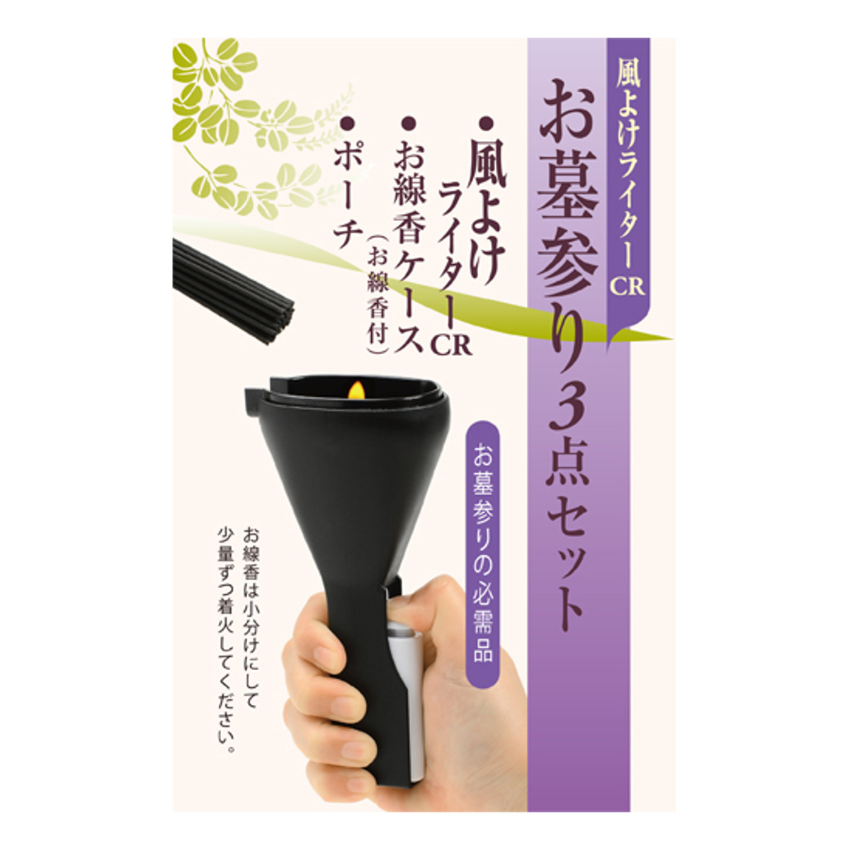 ●フード付きの風よけライターは風があっても火が消えにくく、お線香の火付けがスムーズです。