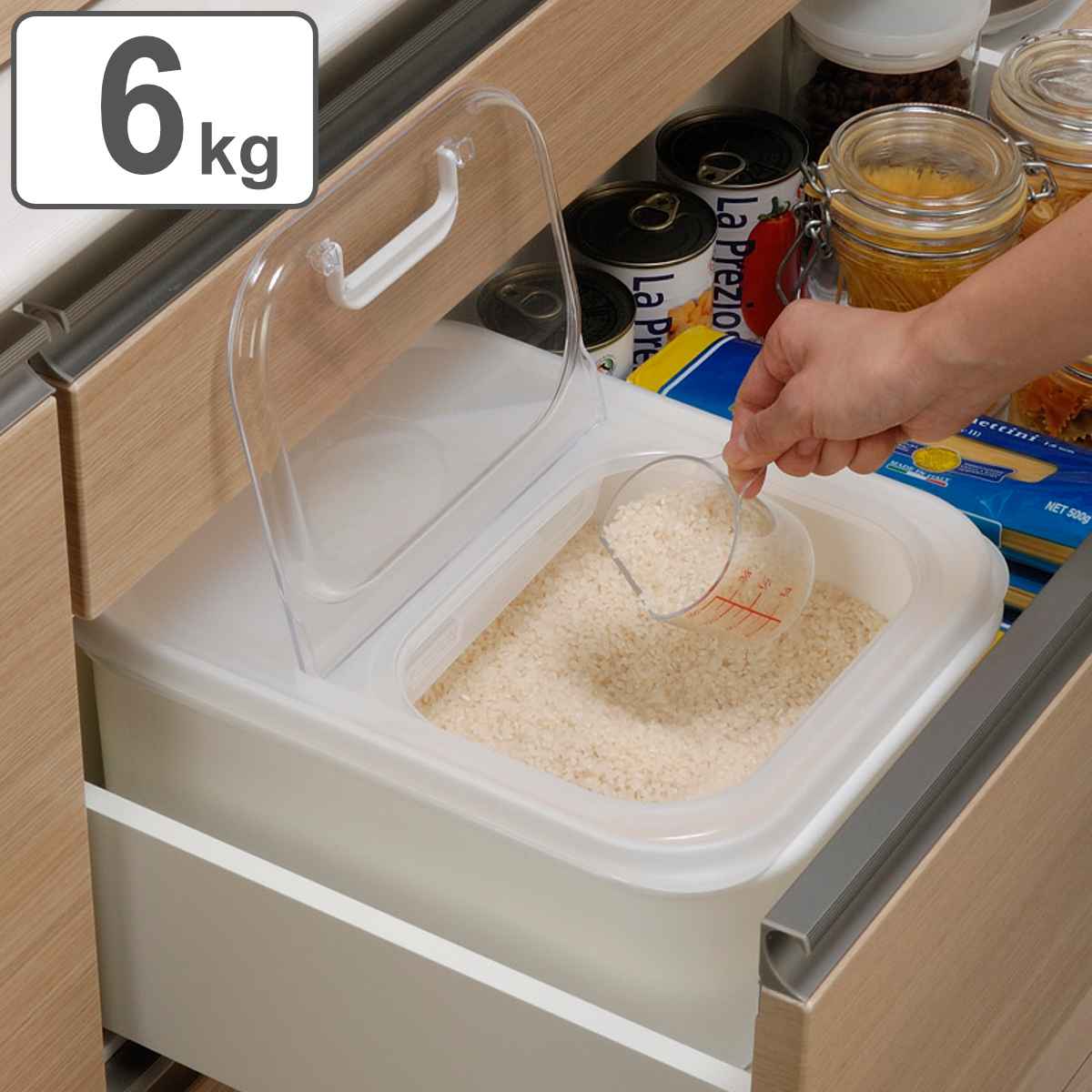 | 残量の確認がしやすい 本体上部は開閉しやすいハンドルつきの透明窓になっており、中身の残量が一目でわかります。 | 使いやすいライスカップ付 付属のライスカップは片側がフラットになっているので、底に残ったお米もすくいやすい形状です。 |