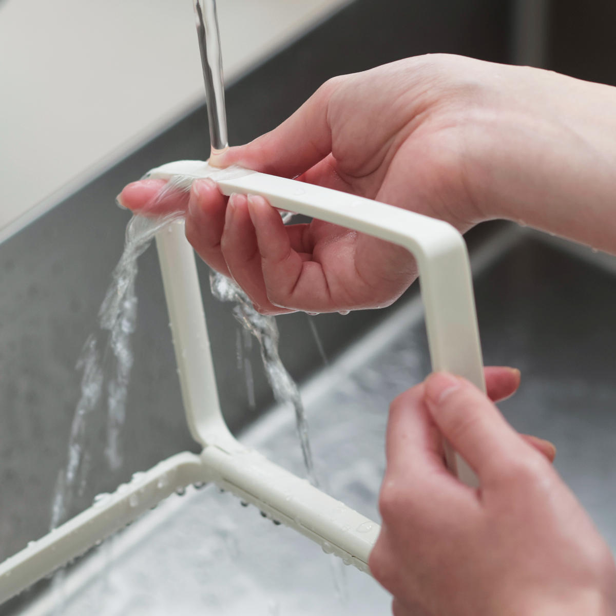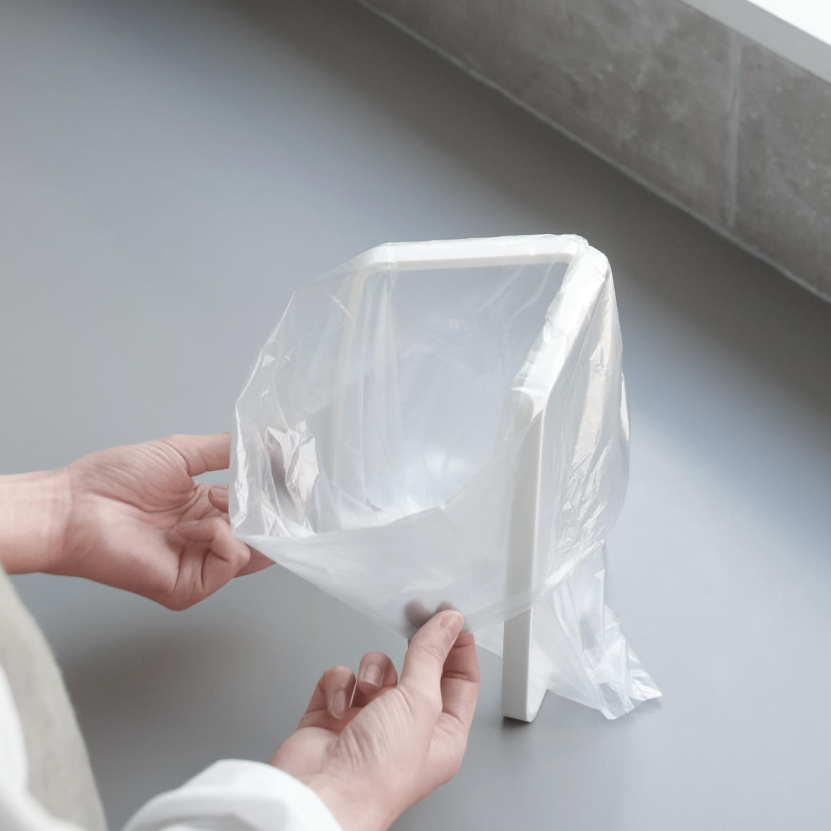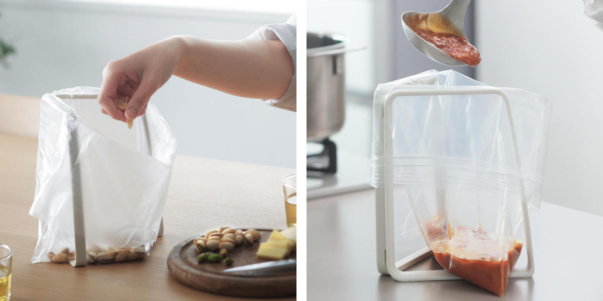 開いたフレームの間にポリ袋を入れて、奥から手前の順にかけるだけ。使い終わった後の取り外しもスムーズです。
