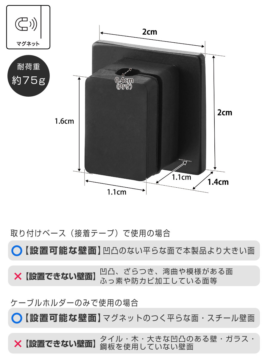 | 材質 | ケーブルホルダー:シリコーンゴム ネオジムマグネット 取り付けベース:スチール(液体塗装) 粘着テープ:アクリル樹脂 |