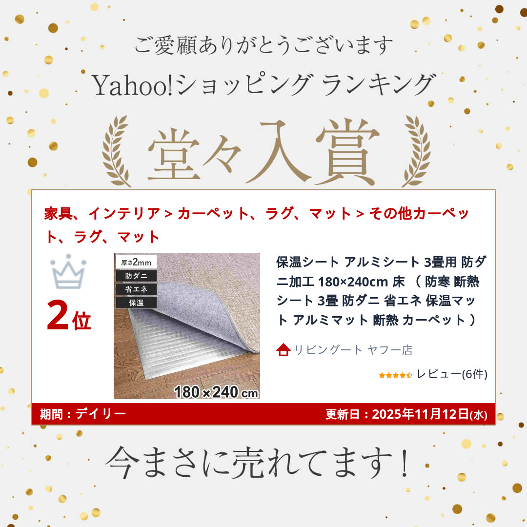 強力な断熱力と熱反射で、熱を逃さないシート3畳用アルミ面にダニを寄せ付けにくい効果のある防ダニ剤を加工しました。ホットカーペットやコタツ敷きの下に敷くだけで、床からの冷気を防ぎ、熱を下に逃さないため温まりが早く、熱を保つ効果があり電気代の節約になります。両面にはズレにくい素材を使用し、シートのズレを防ぎます。三畳用ホットカーペットに最適です。ハサミでカットしてサイズ調節できるため、敷きたい場所に合わせてお使いいただけます。