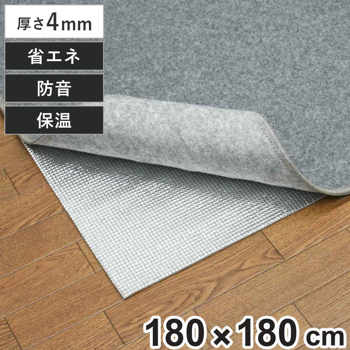 アルミとポリエチレンのダブルパワーアルミフィルムの熱反射により熱を下に逃がさず、発砲ポリエチレン層は床からの冷気をシャットアウトし、ダブルパワーで寒さから足元を守ります。