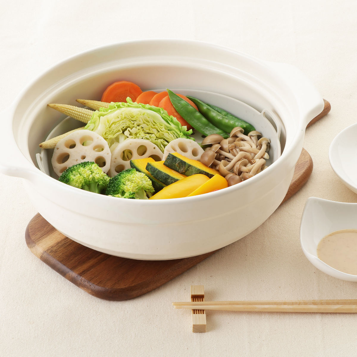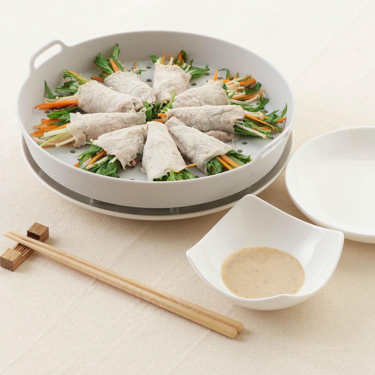 いろいろな蒸し料理を楽しめる蒸し料理は水を使わないため栄養が失われにくく、食材本来のおいしさをそのまま味わえるのが魅力です。蒸ししゃぶや温野菜、肉まんやシュウマイの温めまで、アイデア次第でおいしく、ヘルシーに蒸し料理を楽しめます。