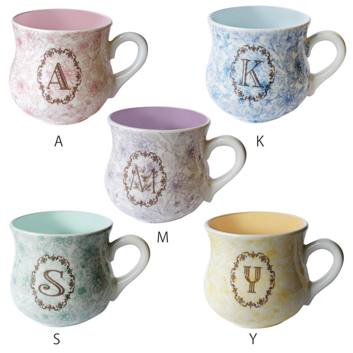 花柄とイニシャルのマグカップ 270mlコーヒーや紅茶など、朝のリラックスタイムにちょうどいいサイズのマグカップです。5種類のイニシャルが揃っているため、家族や来客用として特別感のあるデザインです。マグとしての用途だけでなく、ペン立てや小物入れとしてもインテリアの一部になります。