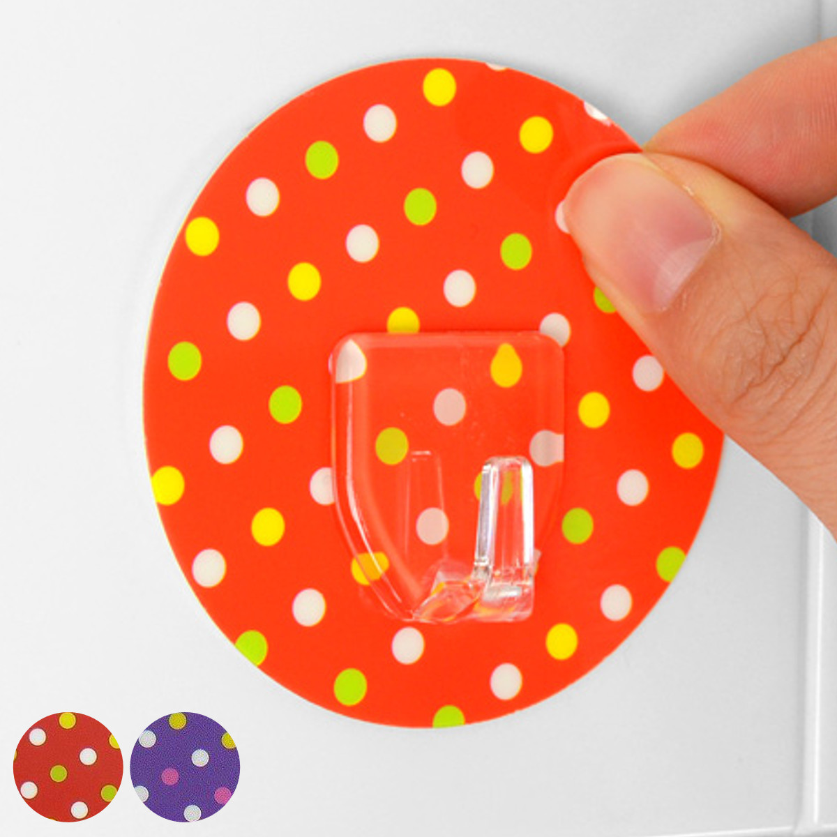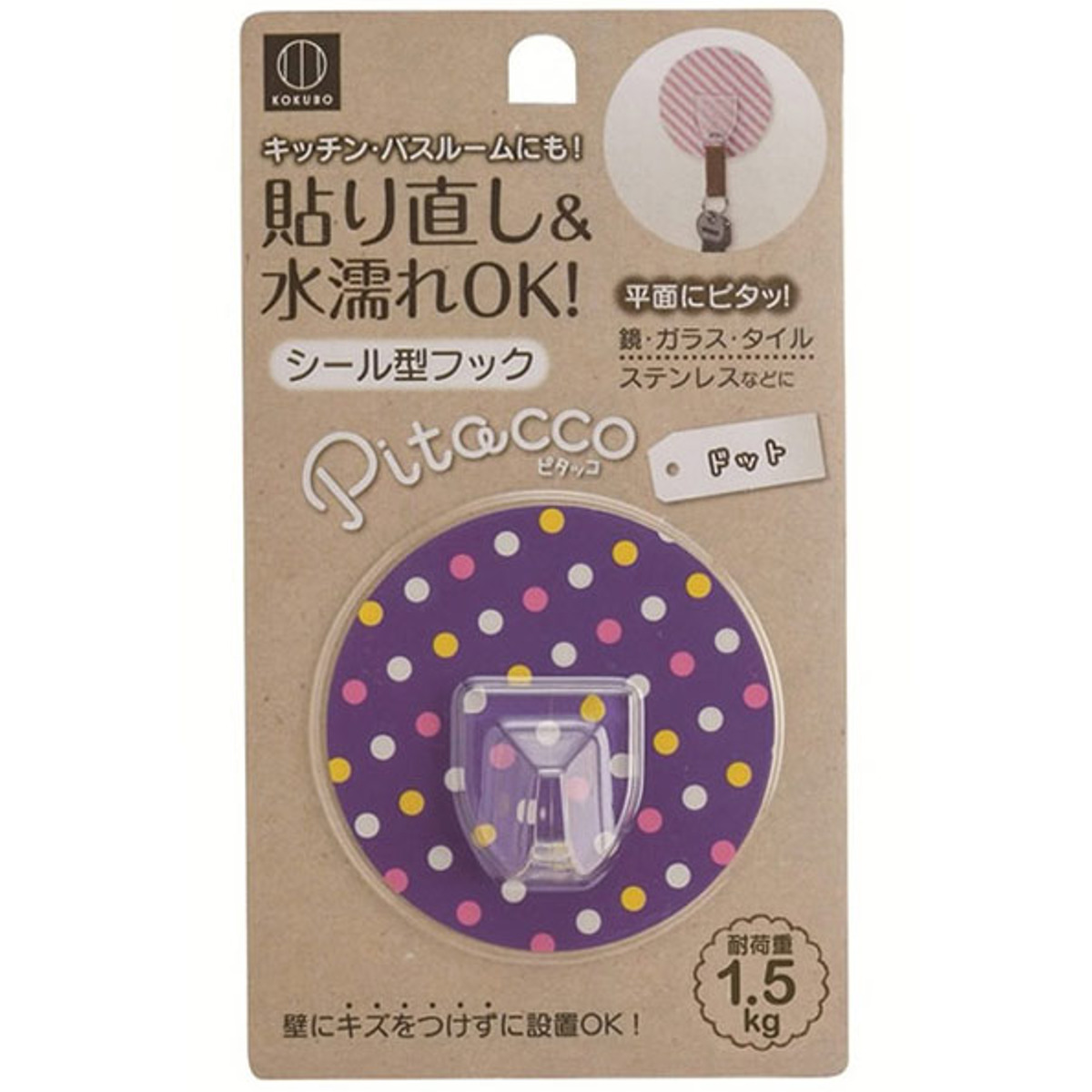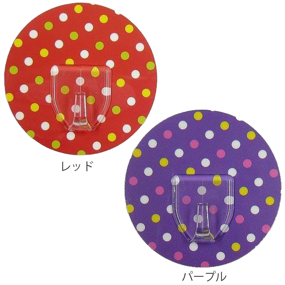 壁をキズつけないシール型フック●壁にキズをつけずに設置できるドット柄のフックです。