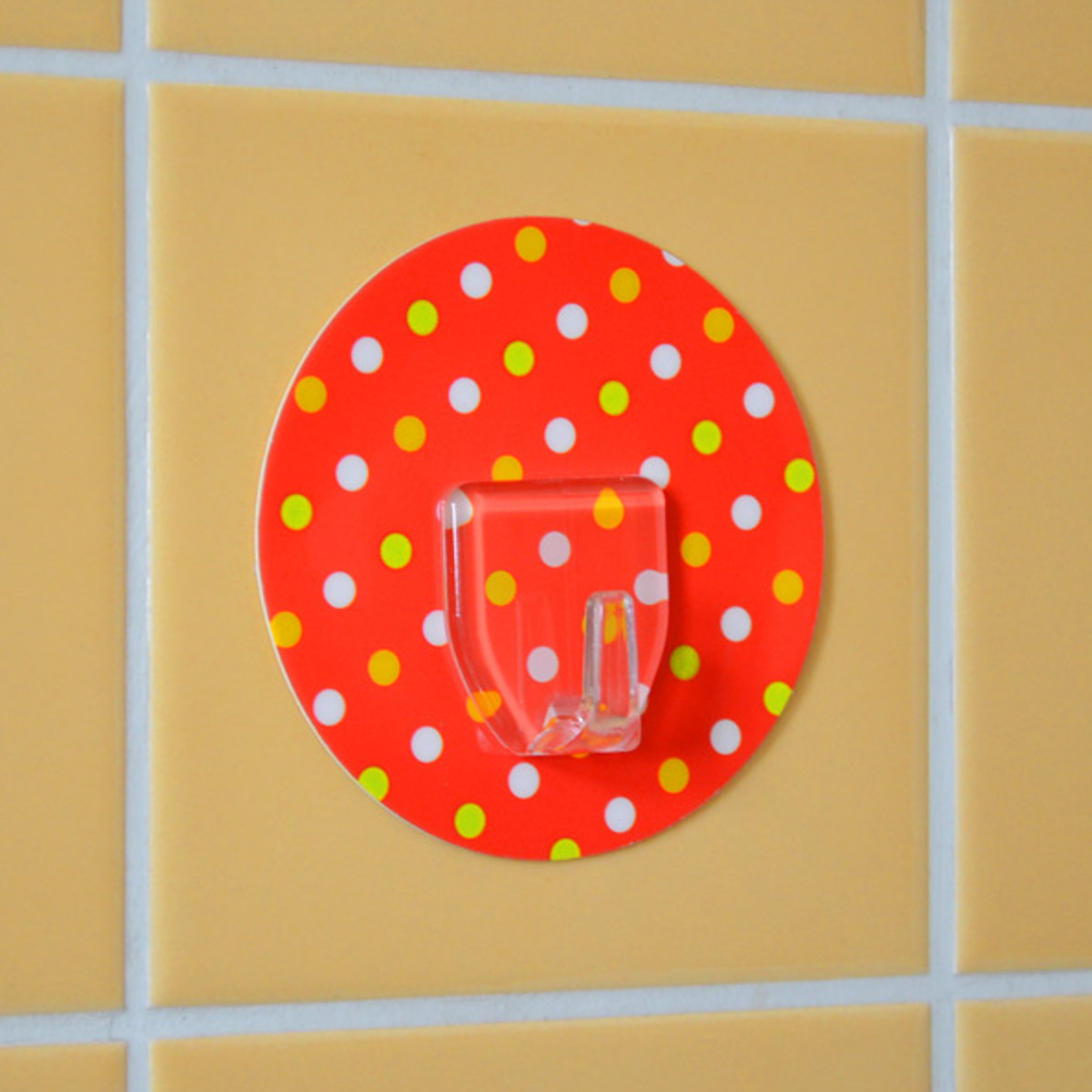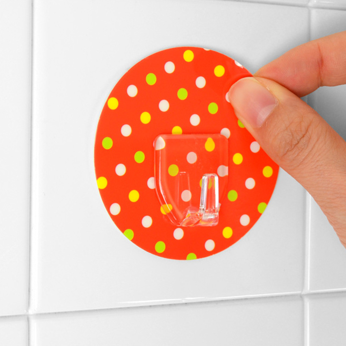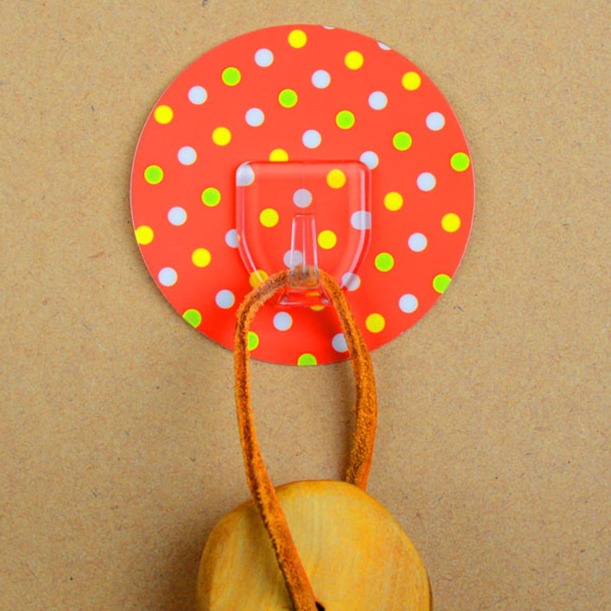壁をキズつけないシール型フック●壁にキズをつけずに設置できるドット柄のフックです。