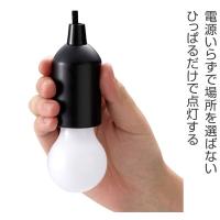 電源がいらない電池式で、場所を選ばずお使いいただけるLEDライトです。ひっぱると点灯・消灯します。裸電球形状のシンプルなデザインだから、お部屋のインテリアとしても使えます。クローゼットや納戸、物置スペースなど、電源がなく暗い場所に最適です。フック付きでポールや棚などにひっかけて使えます。ひもの部分を結べば長さの調節ができます。【商品詳細】 サイズ/約直径5.5×高さ15.5cm※ヒモ・フックを除く ヒモの長さ:約85cm 重量/約60g 内容量/1個 材質/本体・フック:ABS樹脂、レンズ:ポリカーボネート樹脂、ヒモ:ポリプロピレン カラー/白色、黄色 生産国/中国製 型番/ALA-4308 BK、ALA-4308 WH 備考/使用光源:1W(白色・電球色)LED 使用電池:単4形乾電池×3本 明るさ88ルーメン、連続点灯2時間(国内メーカー製アルカリ乾電池使用時) 本品は防水構造ではありませんので、雨など水のかかる場所では使用しないでください。 《スマイルキッズ》
