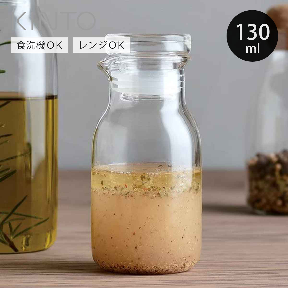 美しく匂いや色移りに強い耐熱ガラス製 ドレッシングボトル 130ml本体とキャップは頑丈な耐熱ガラス製。美しいだけでなく色や匂い移りに強いので、香りの強いガーリックやハーブ類を入れても安心です。