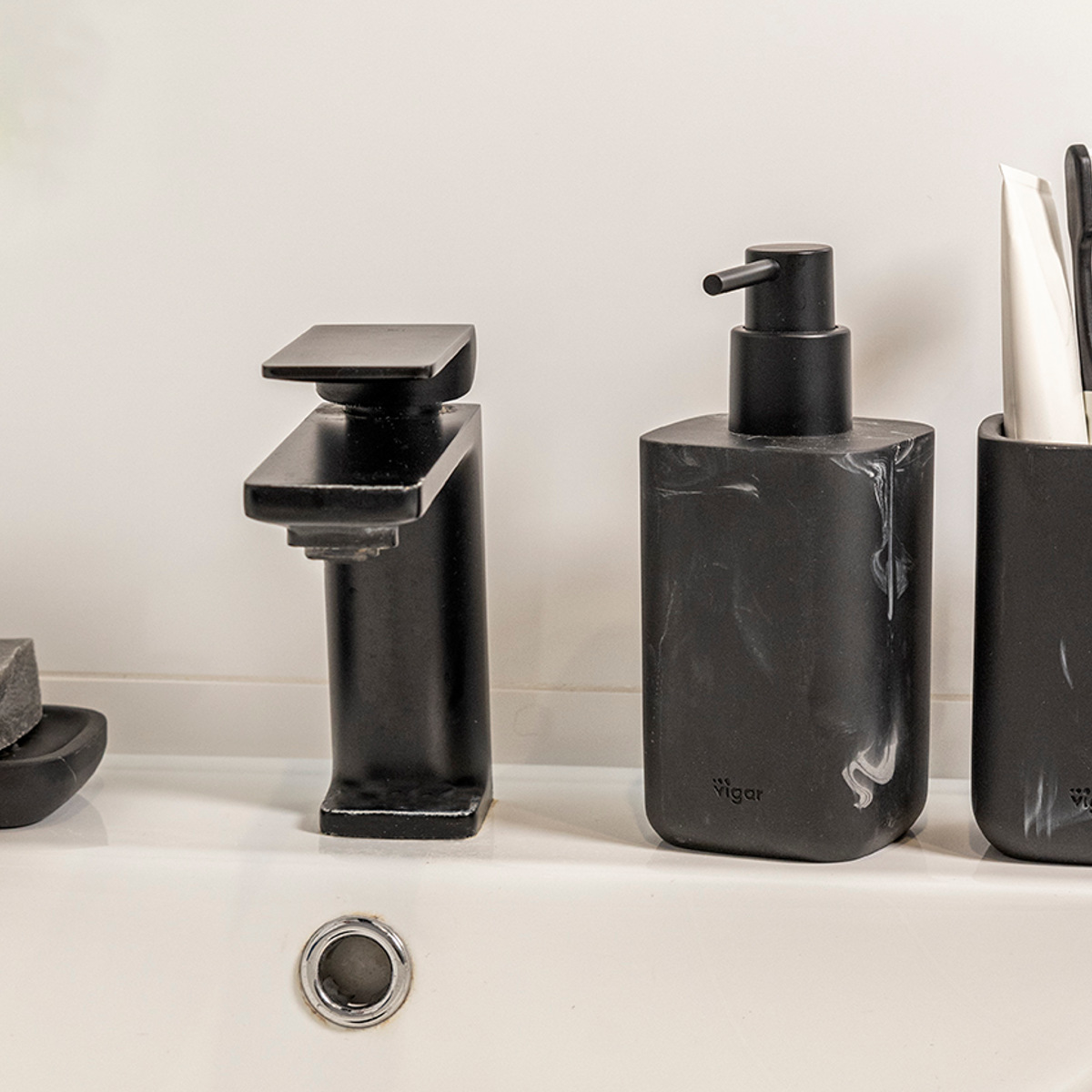 落ち着いたマットな質感のディスペンサーです。シンクにすっきり置けるスリムなフォルムです。重厚感のある佇まいで、洗面スペースやキッチンをワンランク上の空間に仕上げます。