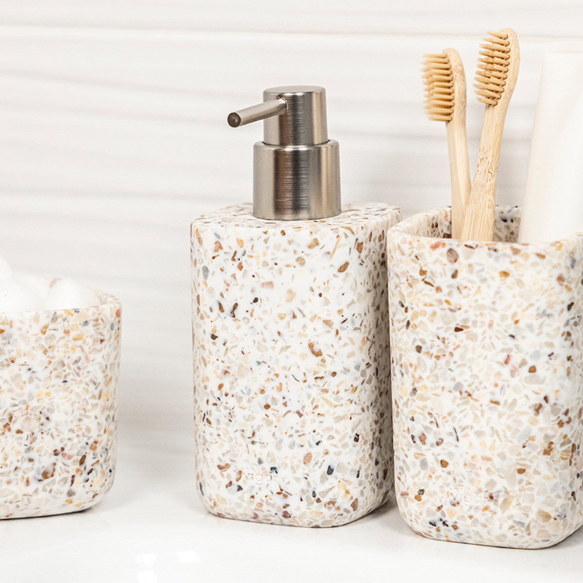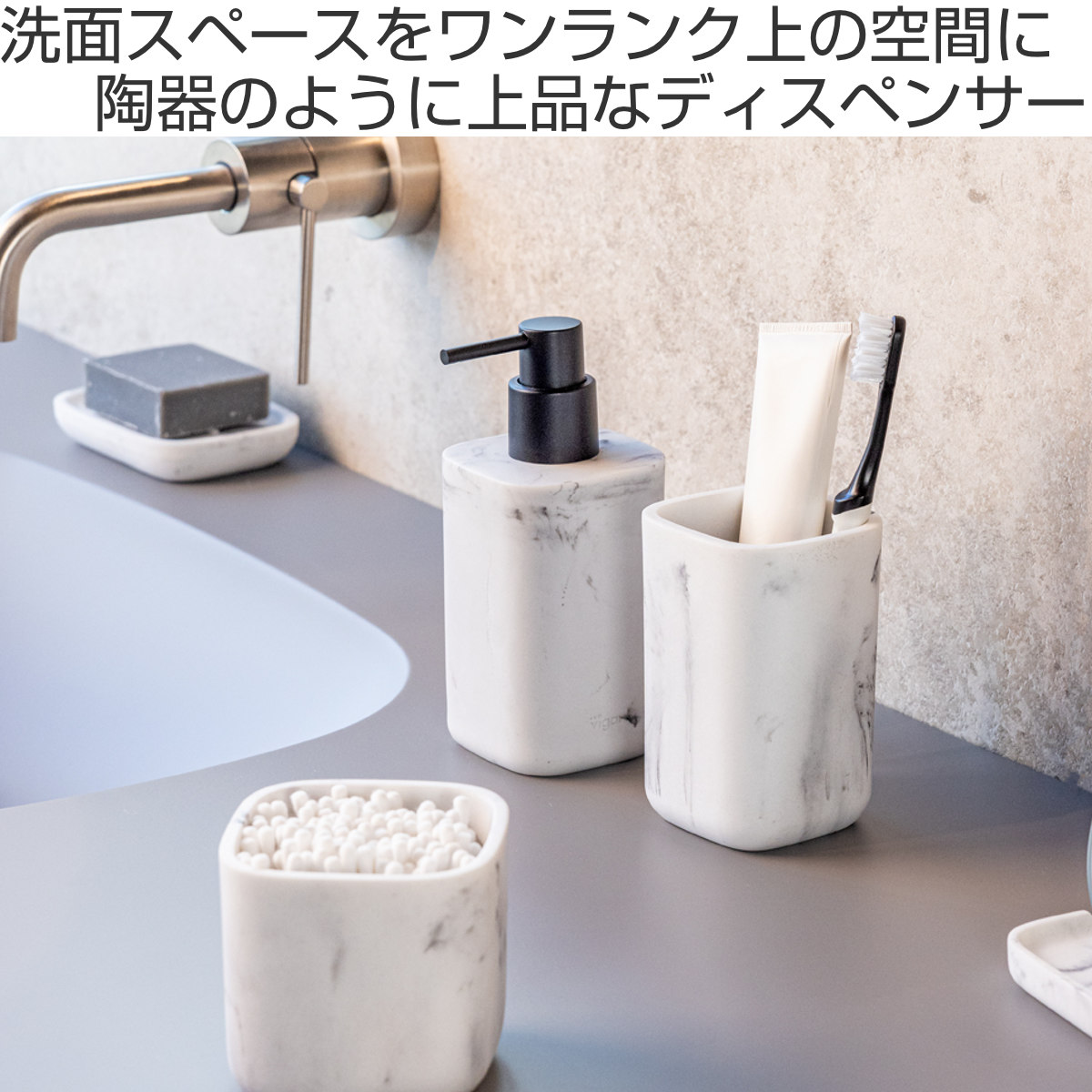 陶器のような見た目で、スタイリッシュなデザインの「ZENSE」の洗面用品シリーズ。収納ケースやソープトレイ・歯ブラシホルダーなど、シリーズで揃えることで統一感のある落ち着いた空間に演出できます。