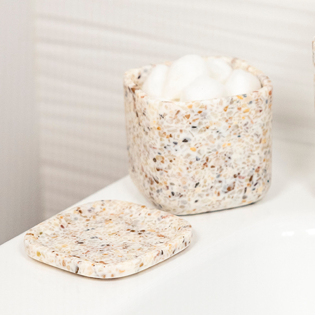 水まわりに強い素材で、長く使える陶器に比べて割れにくく、耐久性に優れたポリレジン素材です。水や湿気に強いので、洗面所やトイレなど水周りの収納として最適です。
