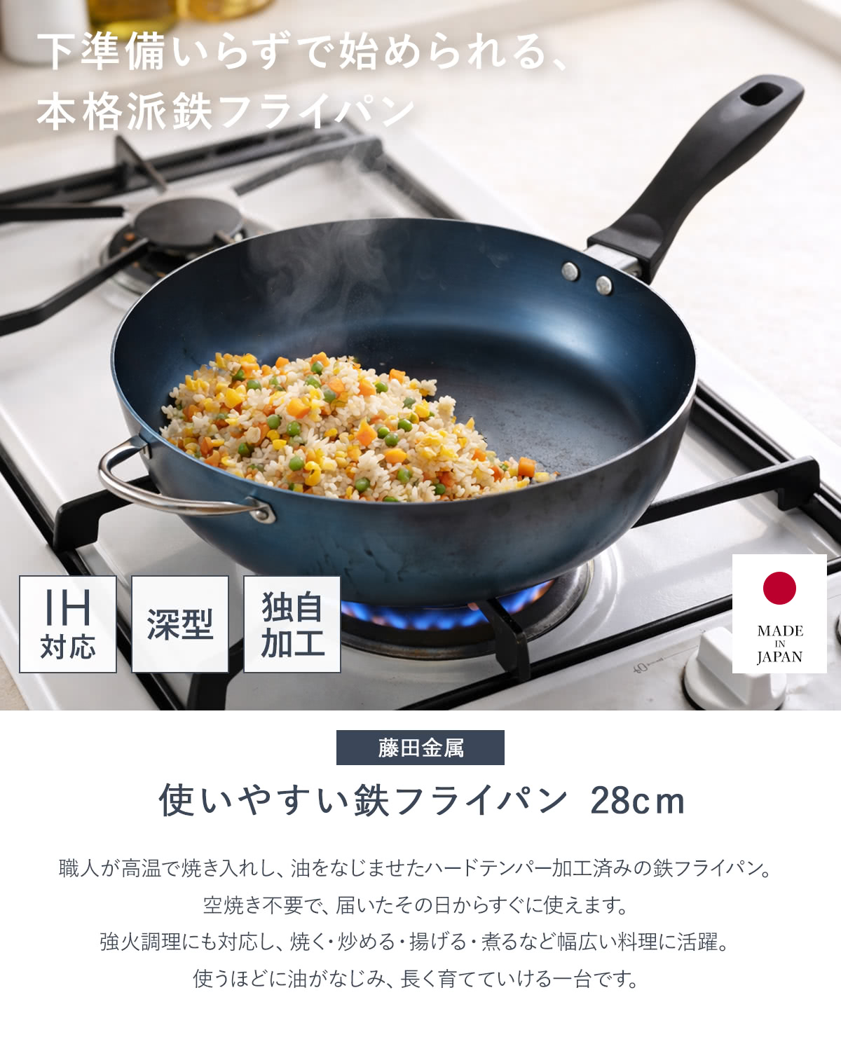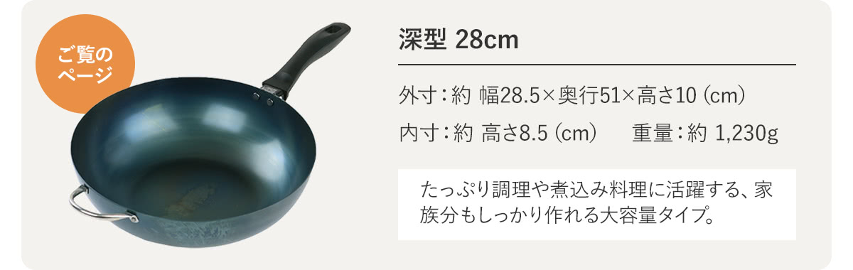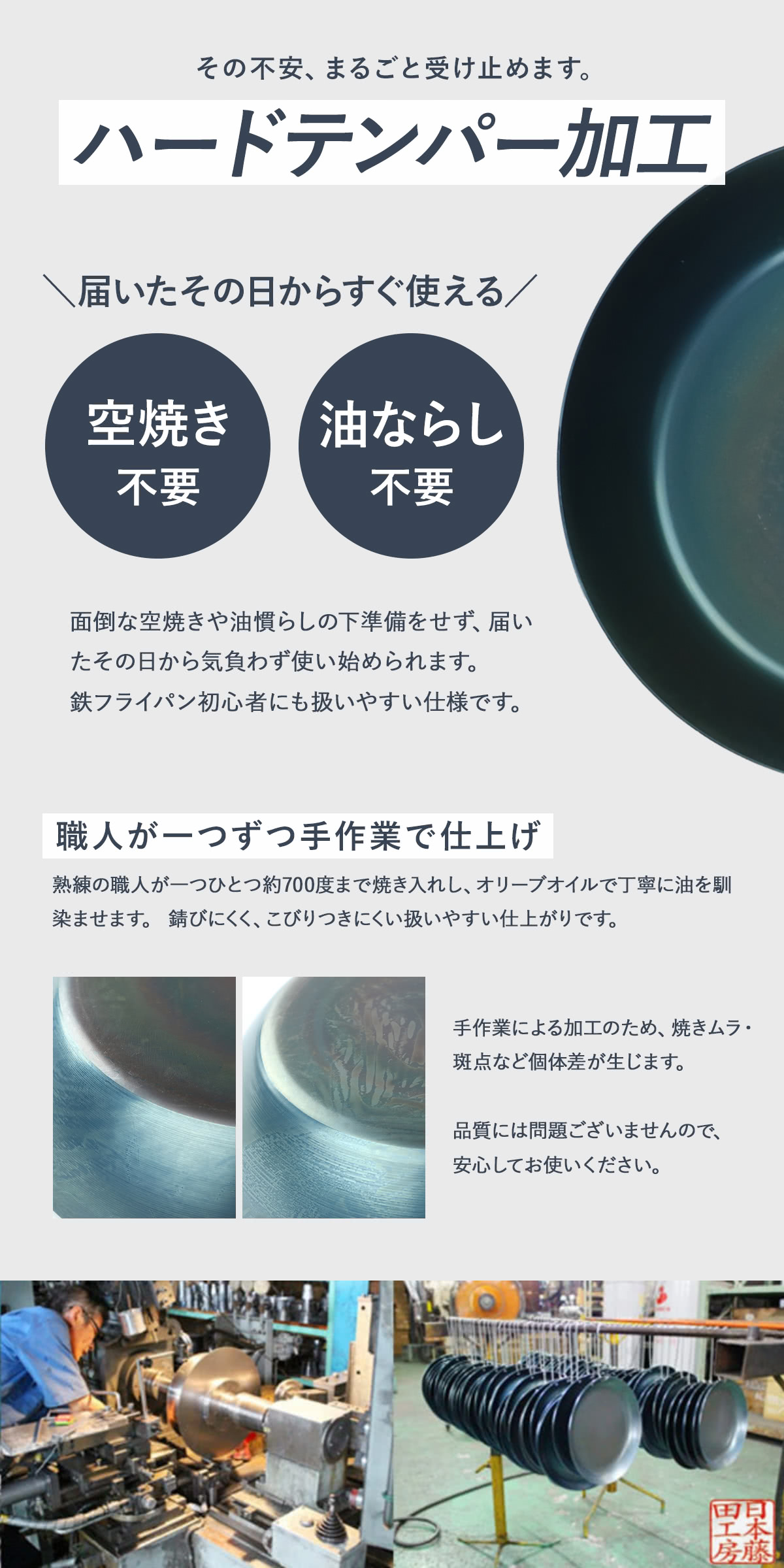 | 備考 | ※こちらの商品はあらかじめ職人の手によって独自の「ハードテンパー加工」が施されています。空焼き、油ならし不要で、お届け後すぐにお使い頂けます。 |