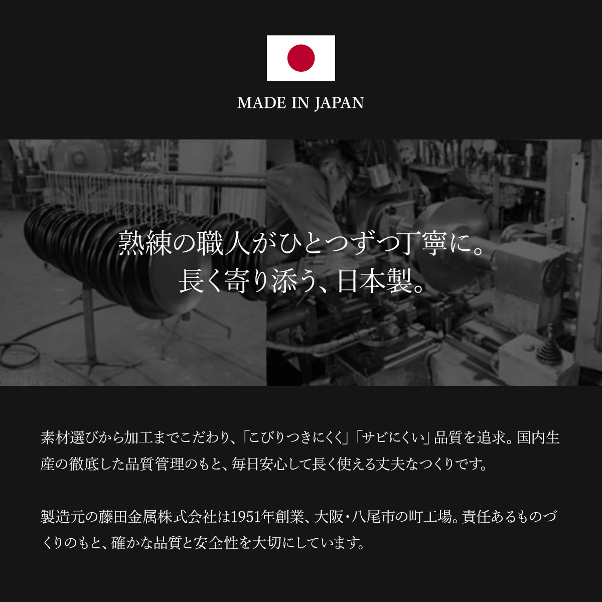 | 材質 | 本体:鉄製(普通鋼板) 表面加工:ハードテンパー加工 取手:アルミ+フェノール樹脂 |