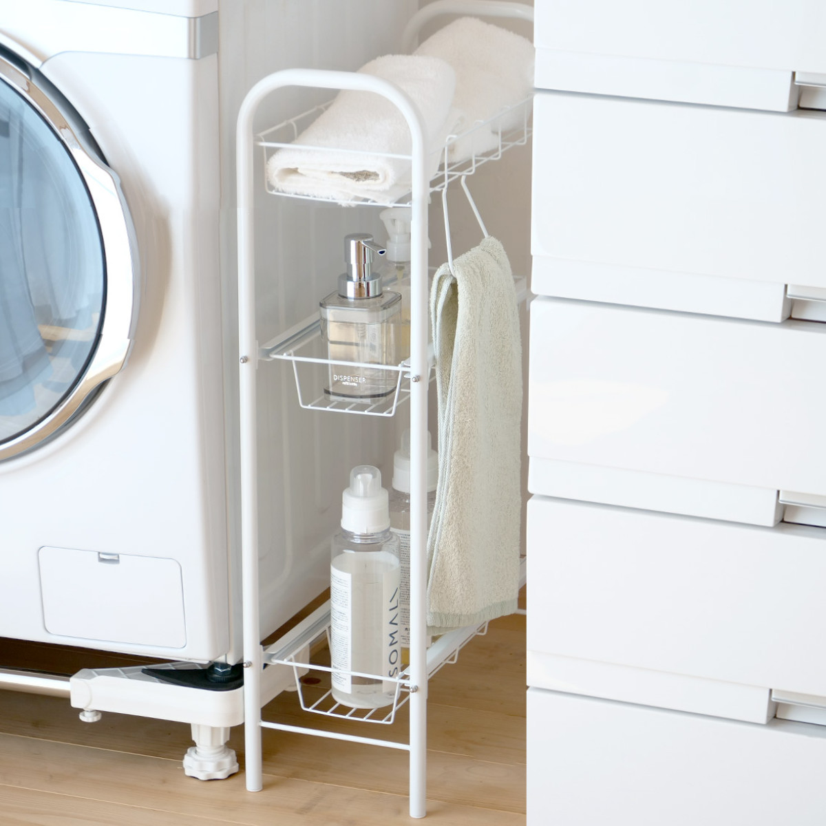 洗濯機横のわずかなスペースに収まる、スリムなランドリーラックです。幅はタオル掛け部分を含んでも約22cmとスリムな設計で、ちょっとした隙間を新たな収納スペースとして有効活用出来ます。たっぷり収納出来る3段タイプなので、洗面小物がスッキリと片付きます。