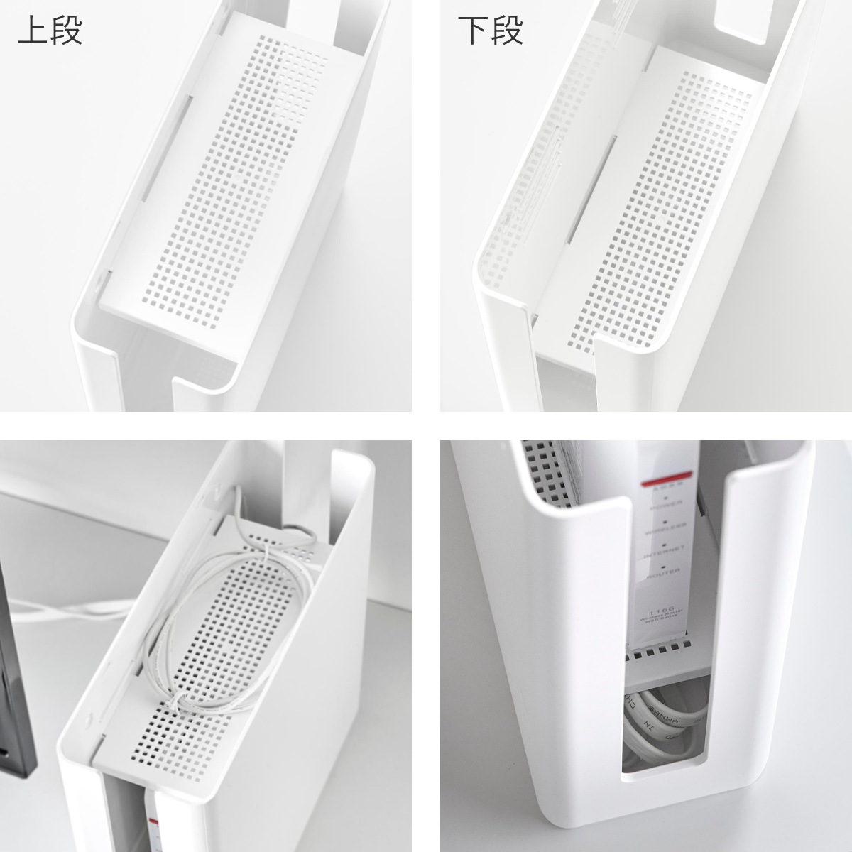 上段に取り付けてケーブルを置いても便利です。 | 下段では棚板の下にケーブルを収納できます。 |