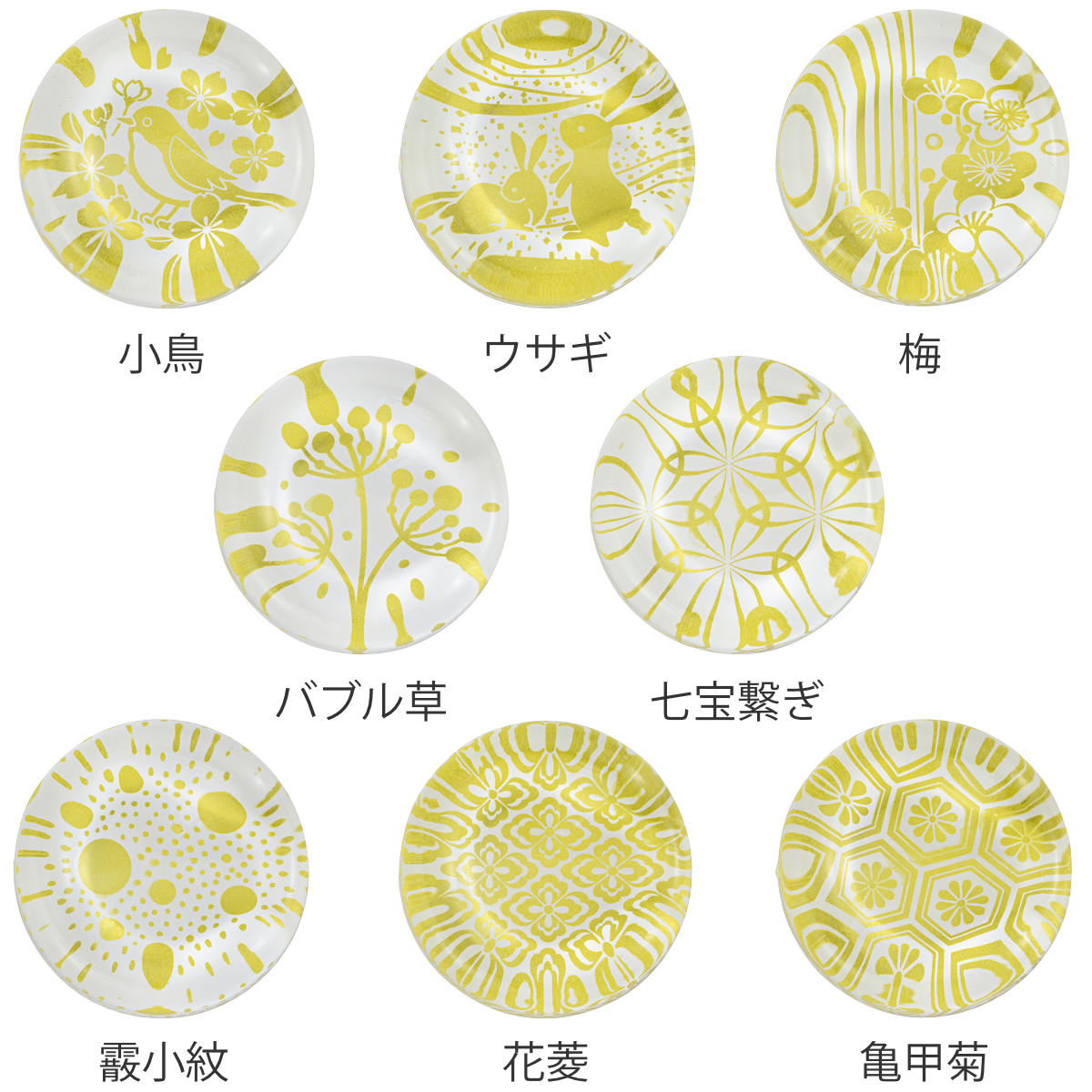 種類/小鳥、ウサギ、梅、バブル草、七宝繋ぎ、霰小紋、花菱、亀甲菊